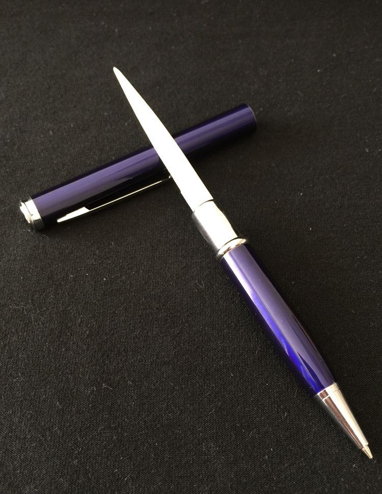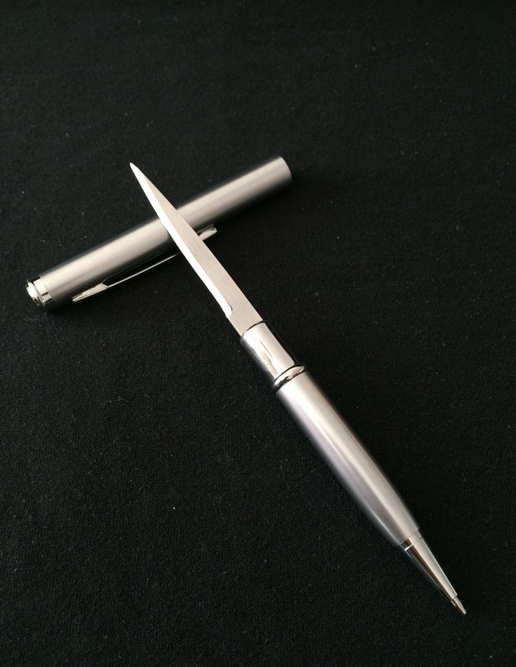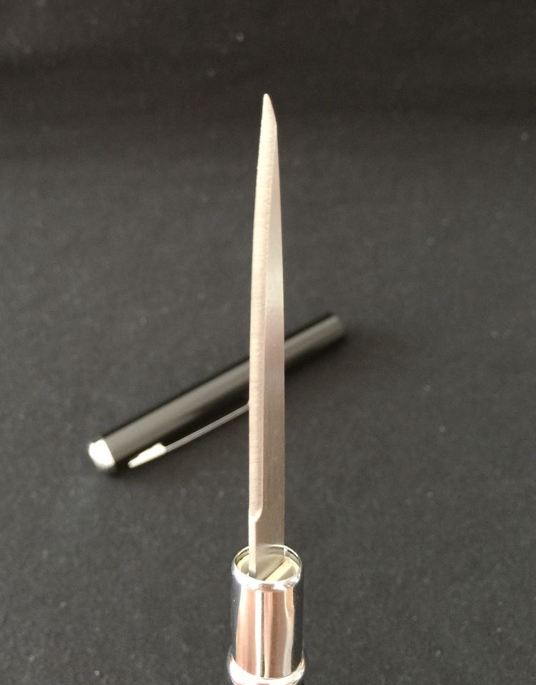 特种防卫笔刀全刃版 刀和套筒全长: 13.5cm 刀和套筒拆开刀柄长: 8cm 刃 长: 5.5cm 刃 宽: 0.7cm(最宽处) 闭 合:(刀刃放进套筒里) 刃 厚: 0.1cm 筒 粗: 1.2cm 刃 材: 420 表 面: 刀身砂光,手把氧化铝 柄 材: 精铸铝,表面氧化 其 他:内带小刀,书写笔 颜 色:银色、金色、迷彩色、红色、蓝色、黑色(购买注明颜色)