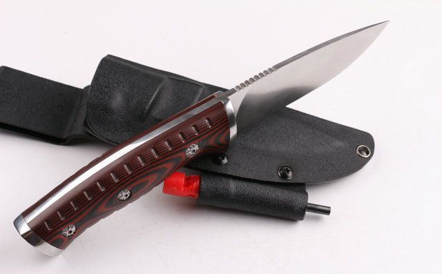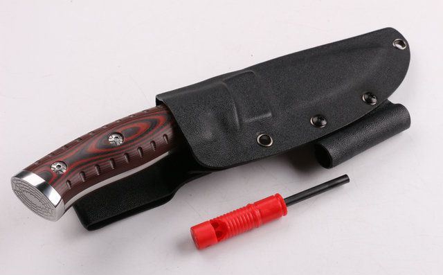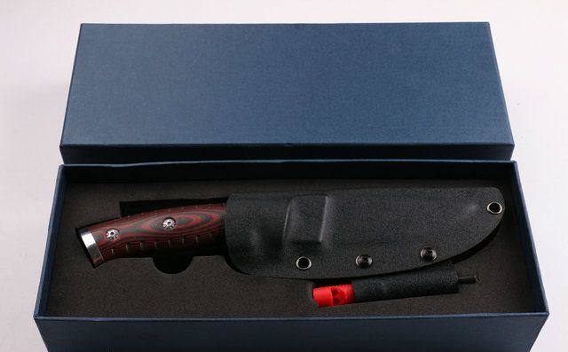 全 长:230mm 刃 长:110mm 柄 长:120mm 刃 宽:32mm 刃 厚:4.2mm 刃 材: 7CR17MOV钢 重 量:600g(含包装) 硬 度:59HRC 表 面:沙光 柄 材:天然彩木 锁 型:定锁 其 他:K鞘+哨子和打火棒 包 装:高级礼品盒