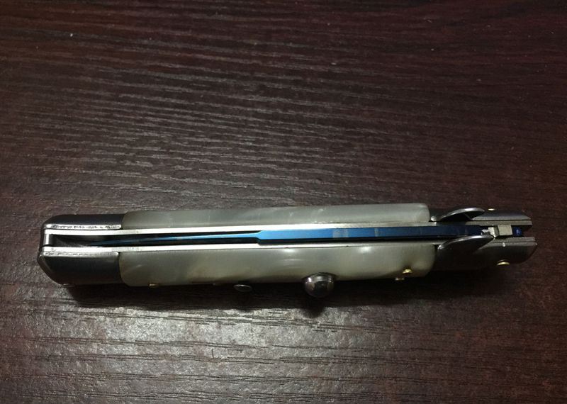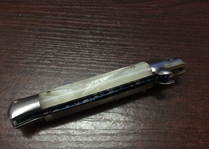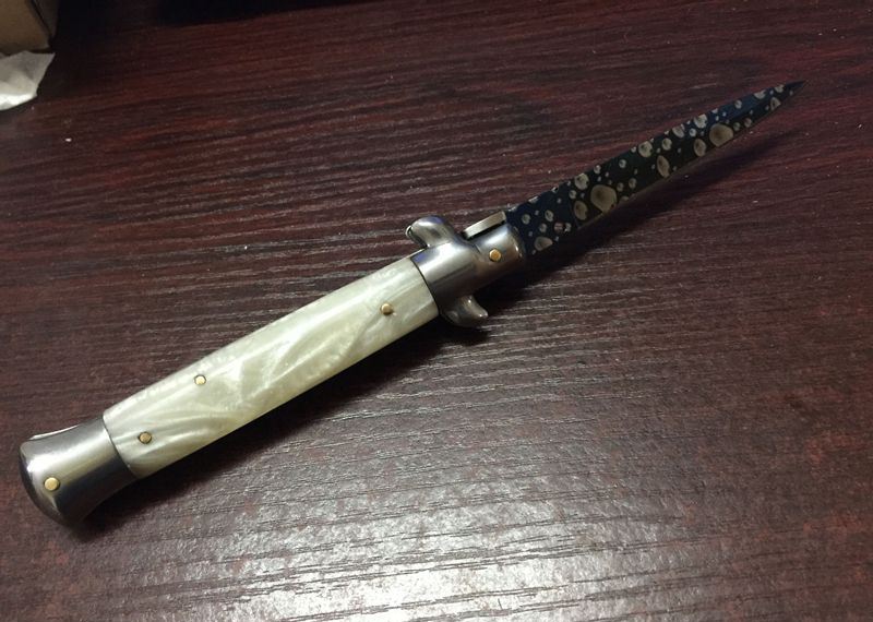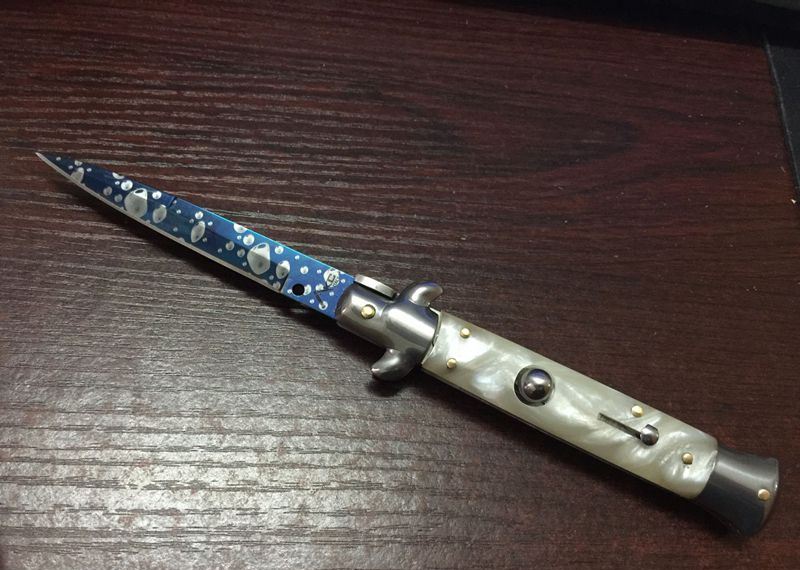 新款9寸AKC意大利黑手党白贝繁星跳刀 全 长:22.9CM 刃 长:10.2CM 柄 长:325MM 刃 厚:3.0mm 刃 材:440 刀 柄:仿贝 开刀方式:弹簧 重 量:150克