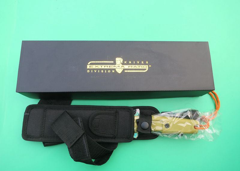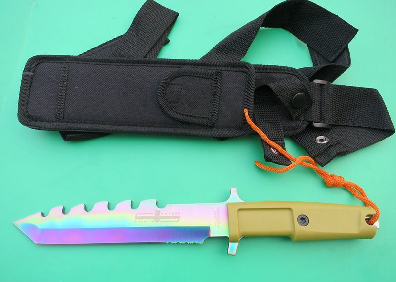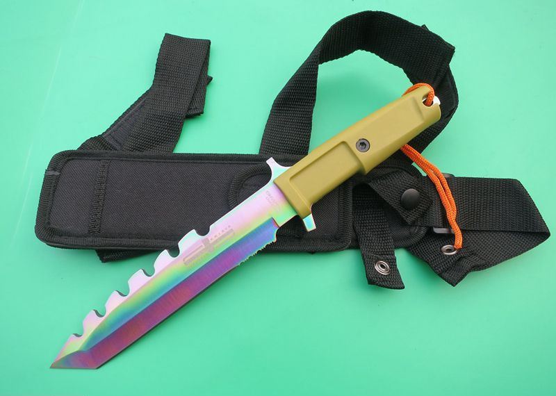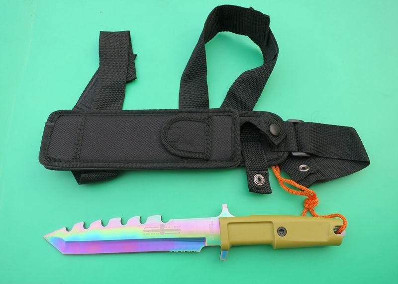 全 长: 32.5cm 刃 长: 19cm 刃 厚: 6mm 刃 材: 5CR15MOV 硬 度: 58HRC 重 量: 620克 表 面: 彩钛版 柄 材: 橡塑 刀 鞘: 尼龙 其 它: 配牛皮纸盒子