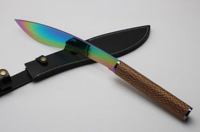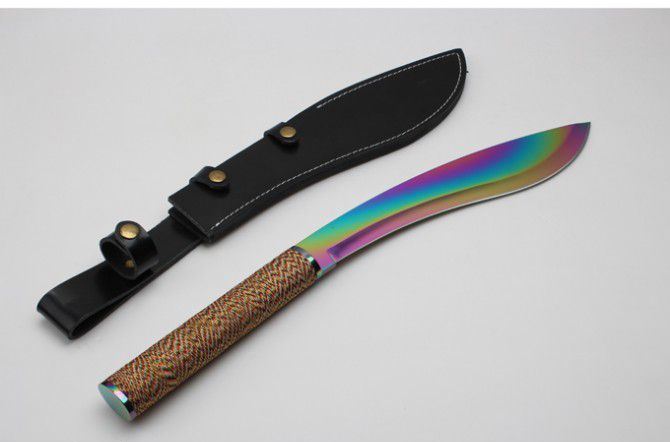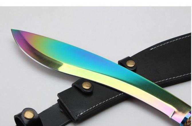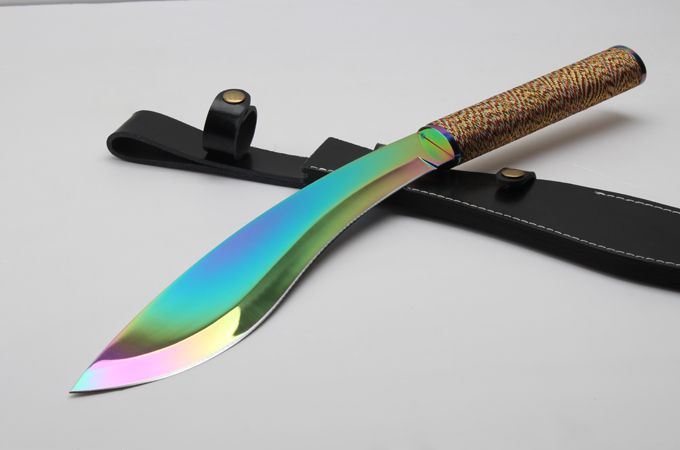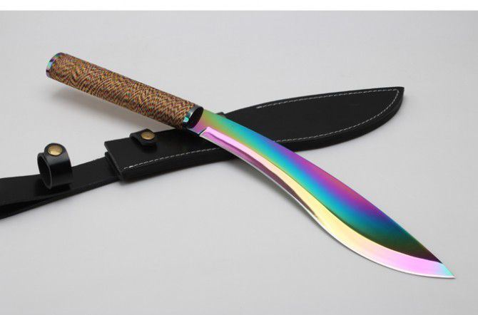 刀奴2太阳神弯刀彩钛版 全 长. 545mm 刃 长:345mm 柄 长:200mm 刃 宽:60mm 刃 厚:5.3mm 刃 材:5Cr13Mov 重 量:1162g(含包装) 硬 度:57HRC 表 面:彩钛 柄 材:钢+黑檀木+防滑绳 锁 型:定锁 其 他:配皮套