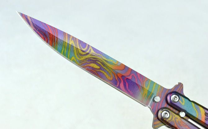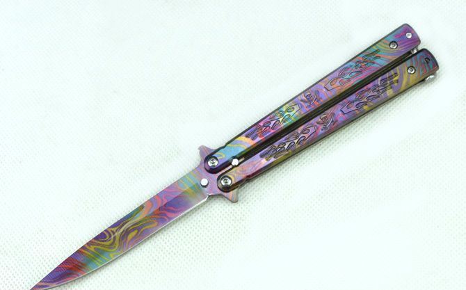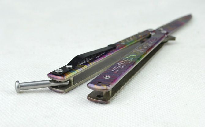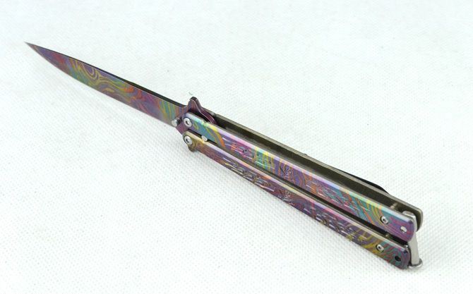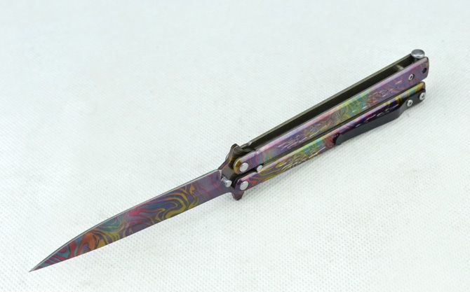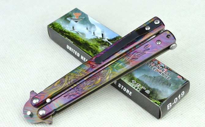 蝴蝶B019甩刀 全 长:22.4cm 刃 长:9.5cm 柄 长:12.2cm 刃 宽:1.5cm(最宽处) 刃 厚:2.5mm 刃 材:420 硬 度:53HRC 刀 柄:钢柄(幻彩披覆) 表 面:幻彩披覆 重 量:133克(含彩盒) 备 注:带腰夹