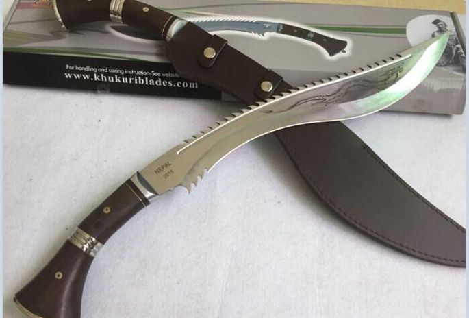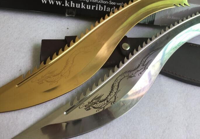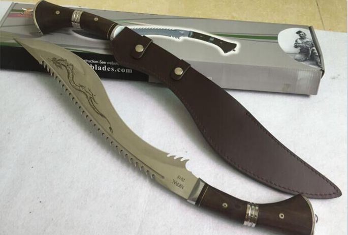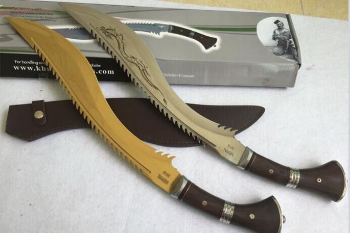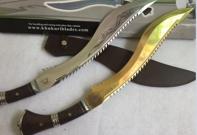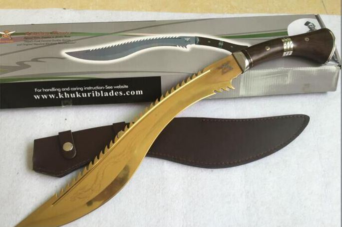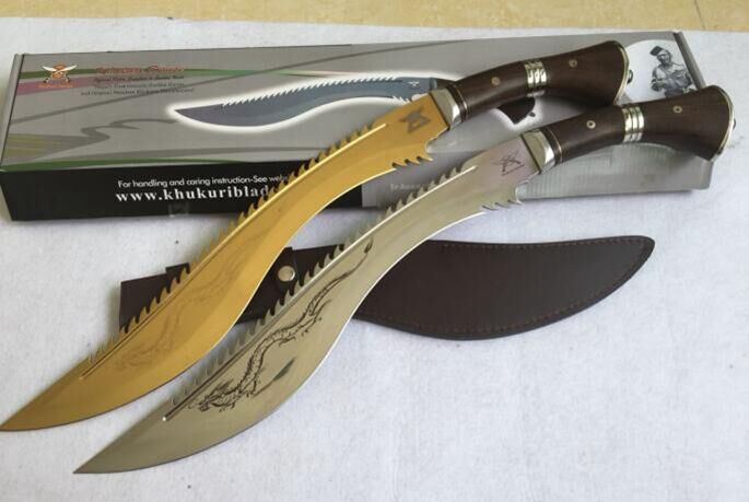 廓尔喀锐霸(黄金版、镜光版) 全长:61cm 刃长:44cm 厚度:0.58cm 刃宽:6.3cm 硬度:57 刃材:5Cr15M0V 柄材:非洲花梨木 其他:全刃、镜光,附真皮刀套,彩盒及说明书
