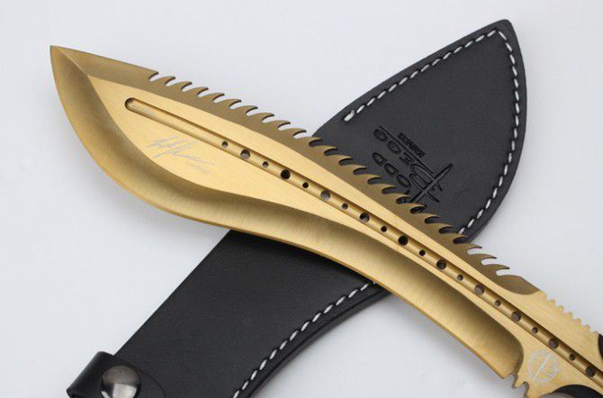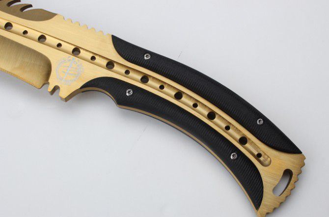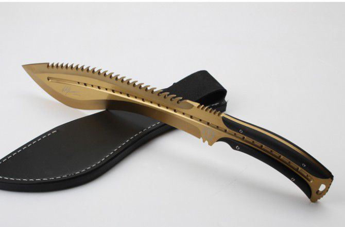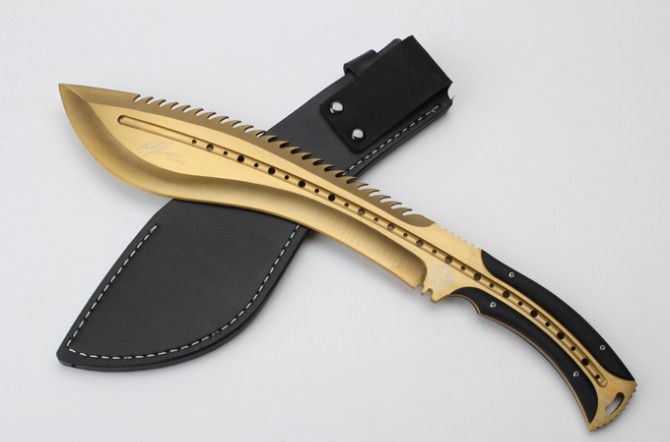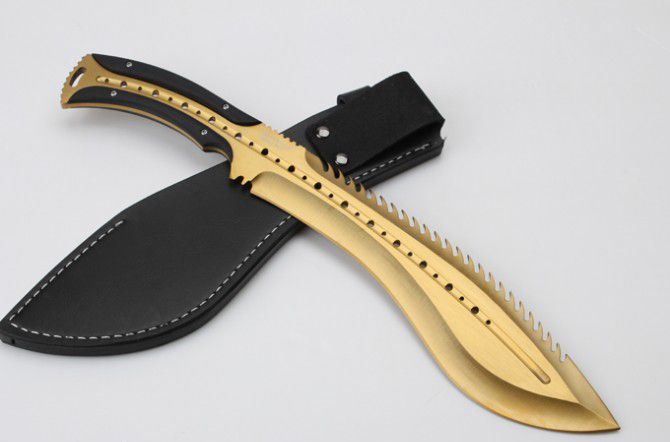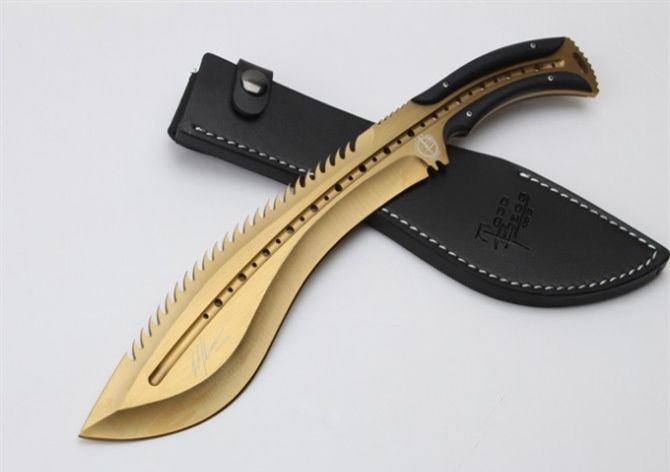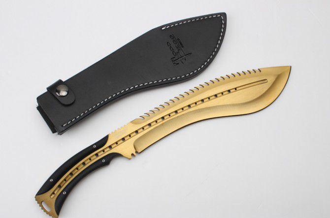 托德贝格恶龙狗腿刀(黄金版) 全 长:355mm 刃 长:23mm 柄 长:120mm 刃最宽:55mm 刃 厚:6mm 刃 材:8cr18mov 重 量:560g(含包装) 硬 度:59HRC 表 面:金色 柄 材:钢一体柄+G10条