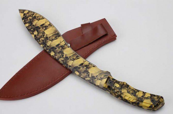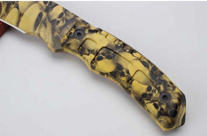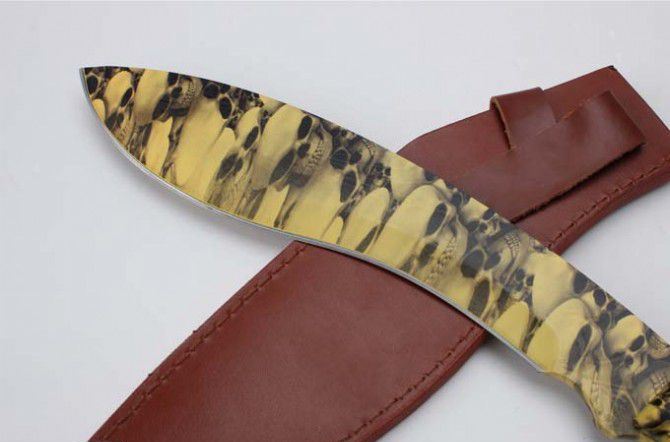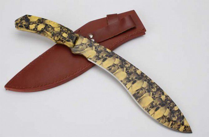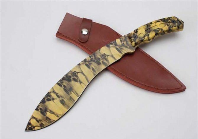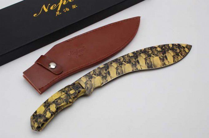 尼泊尔巴雷特狗腿刀(迷彩版) 全 长:39.5cm 刀 刃:26.1cm 柄 长:12.5cm 刃 宽:4.9cm(最宽处) 刃 厚:6.5mm 刃 材:5CR13MOV 硬 度:58HRC 刀 柄:ABS 表 面:迷钛 重 量:950克(含包装) 备 注:原厂彩盒