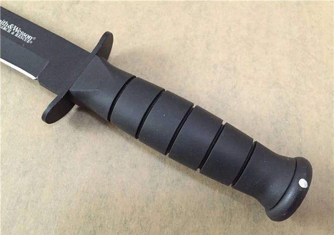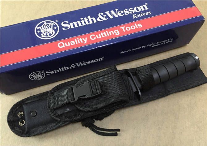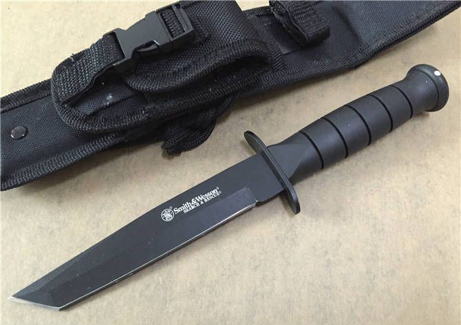 史密斯.威森CKSURT直刀 全长:26.5cm 刃长:15.3cm 柄长:11.4cm 刃厚:4mm 刃宽:2.9cm 刃材:420J2 柄材:橡塑 硬度:56Hrc 净重:205g 毛重:263g 表面:喷粗砂 刀套:尼龙套