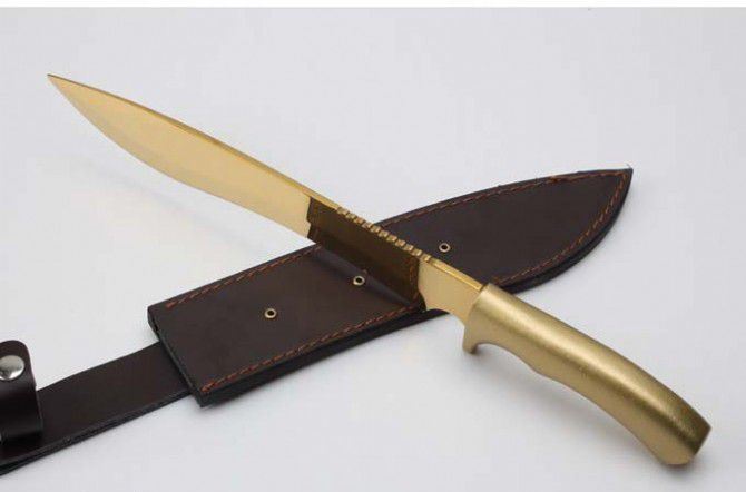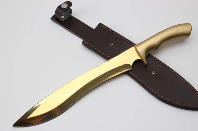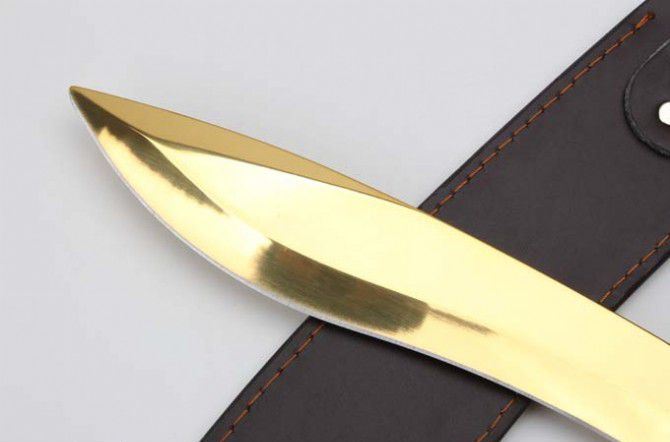 全 长:428mm 刃 长:293mm 柄 长:133mm 刃最宽:45mm 刃 厚:5mm 刃 材:9cr18mov 重 量:1170g(含包装) 硬 度:59HRC 表 面:金色 柄 材:一体钢+铝柄