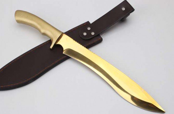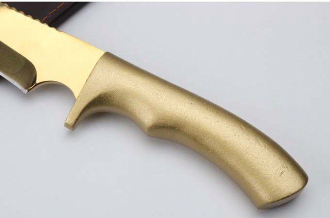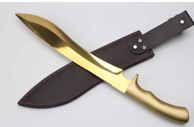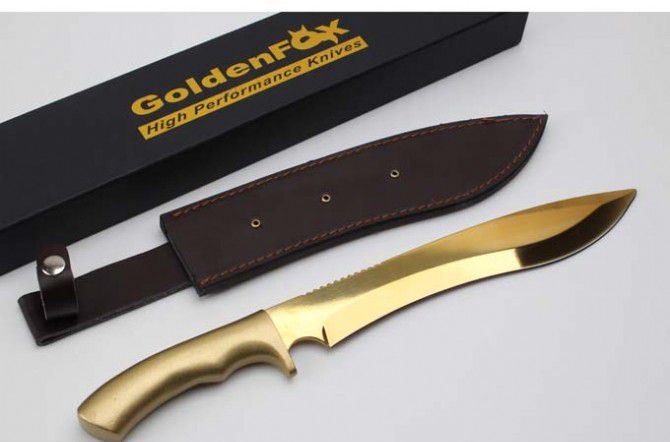 金狐狸一体铝柄狗腿刀 全 长:428mm 刃 长:293mm 柄 长:133mm 刃最宽:45mm 刃 厚:5mm 刃 材:9cr18mov 重 量:1170g(含包装) 硬 度:59HRC 表 面:金色 柄 材:一体钢+铝柄