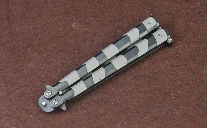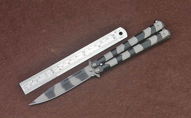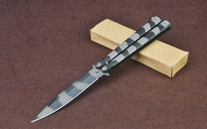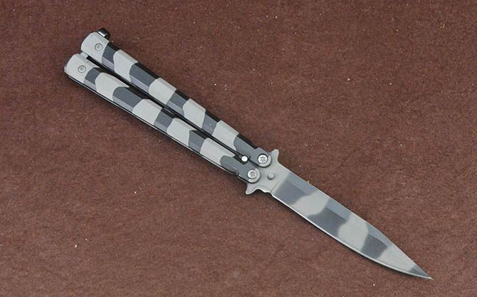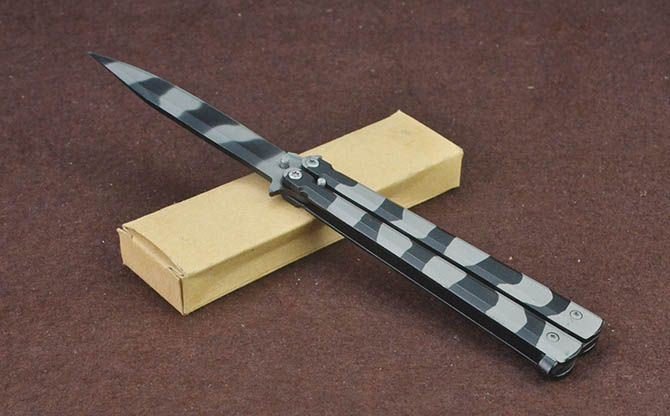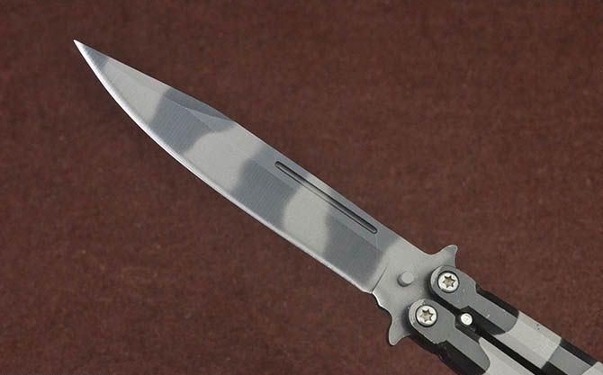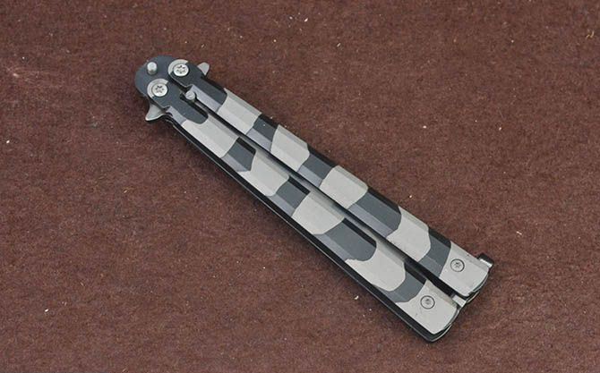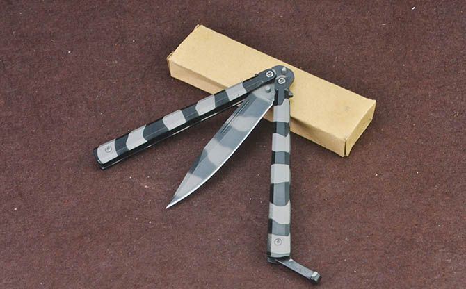 蝴蝶14S-10灰斑马甩刀 全 长:22cm 刃 长:9cm 柄 长:12cm 刃 宽:1.7cm 刃 厚:2.5mm 刃 材:3Cr13Mov 重 量:123g(含包装) 硬 度:54HRC 表 面:发黑+喷砂 柄 材:全钢 包 装:纸盒
