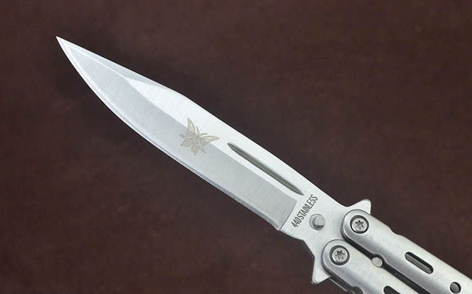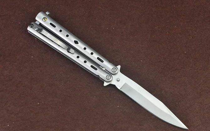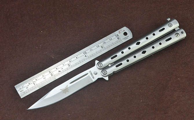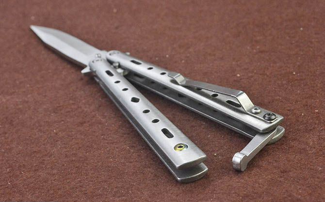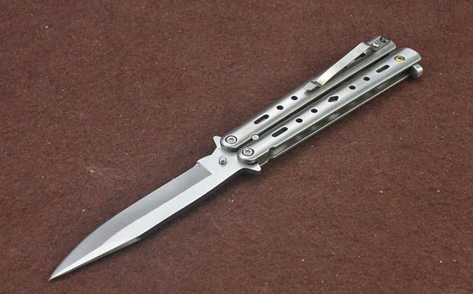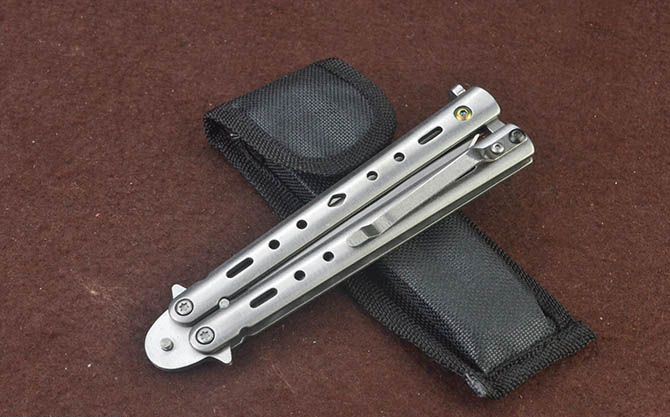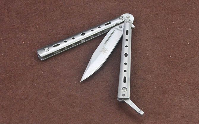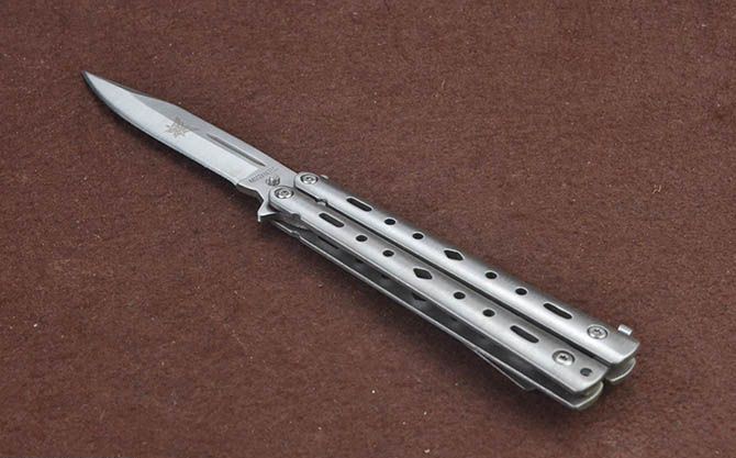 蝴蝶沙钢甩刀 全 长:22.6cm 刃 长:9cm 柄 长:12.3cm 刃 宽:1.9cm 刃 厚:2.8mm 刃 材:3Cr13Mov 重 量:158g(含包装) 硬 度:54HRC 表 面:砂光 柄 材:砂光 包 装:尼龙套