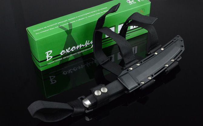 全 长: 30.7cm 刃 长: 17.5cm 刃 厚: 4.6mm 刃 材: 440C 硬 度: 58HRC 表 面: 砂光 柄 长: 13cm 柄 材: 橡塑 刀 鞘: K鞘(有绑腿带) 重 量; 266克 毛 重: 600克(含K鞘、精美纸盒)