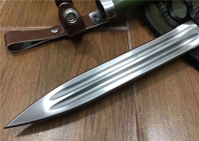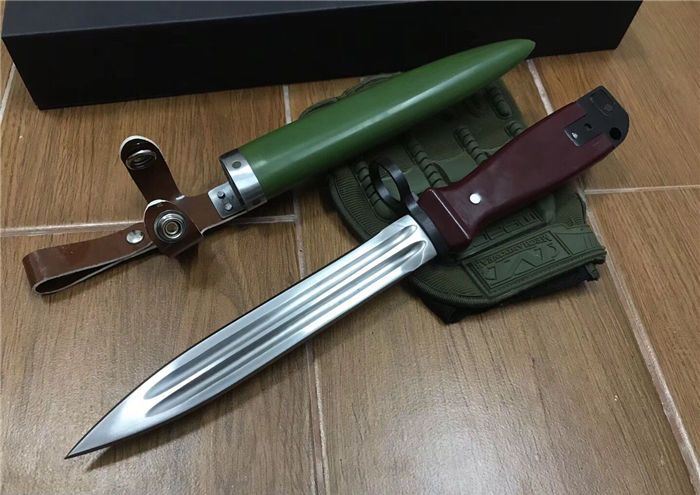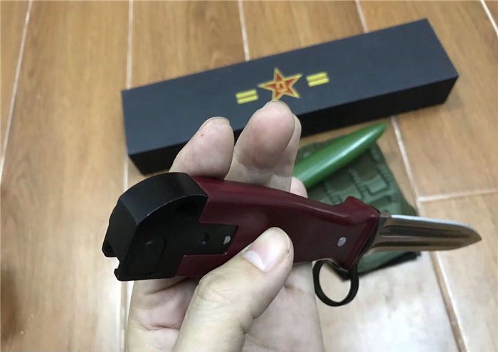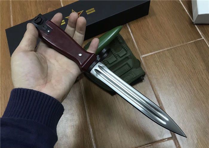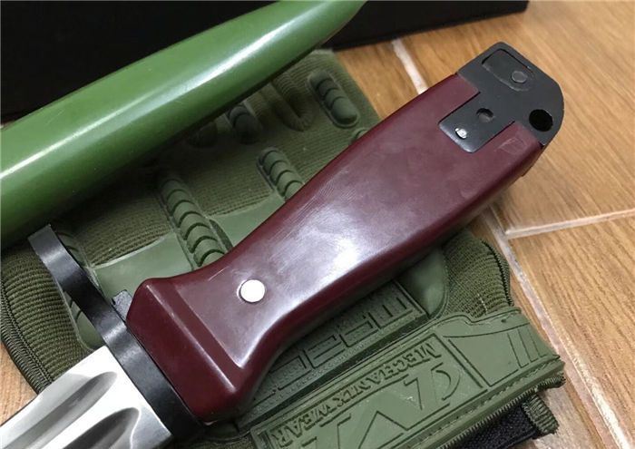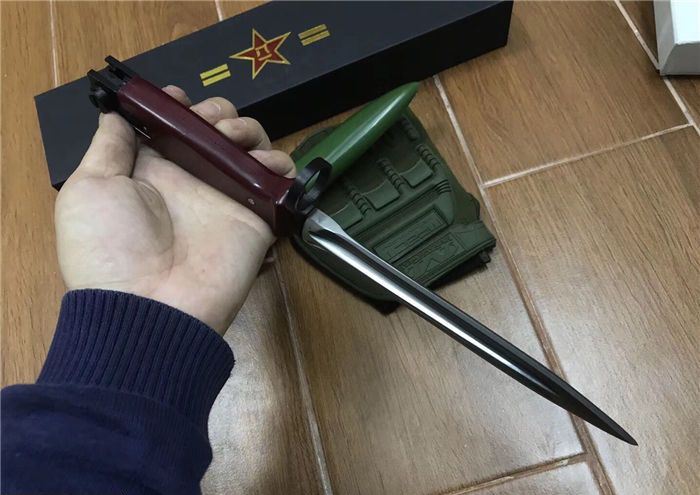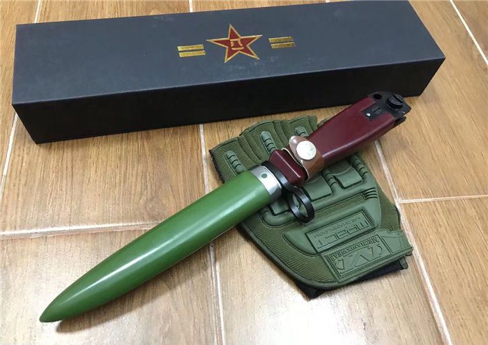 超高仿八一军刺 全长:29.8cm 柄长:12.8cm 刃长:17cm 刃宽:2.3cm 刃厚:12mm 硬度:60HRC 表面:砂光 刃材:军用钵(合金钢) 鞘材:军用ABS 柄材:电木+钢 总重:320g