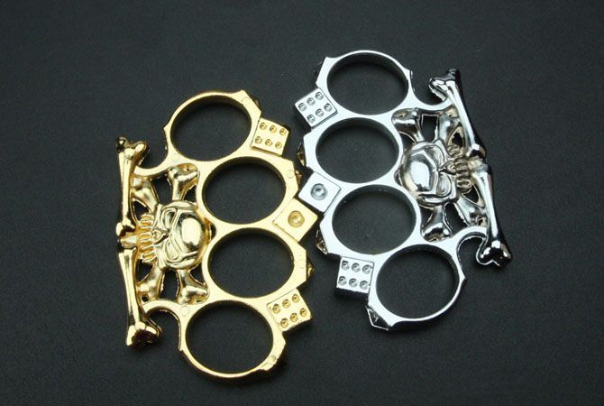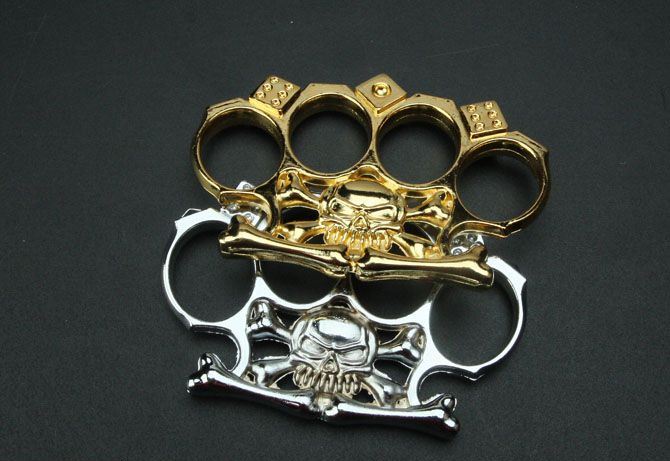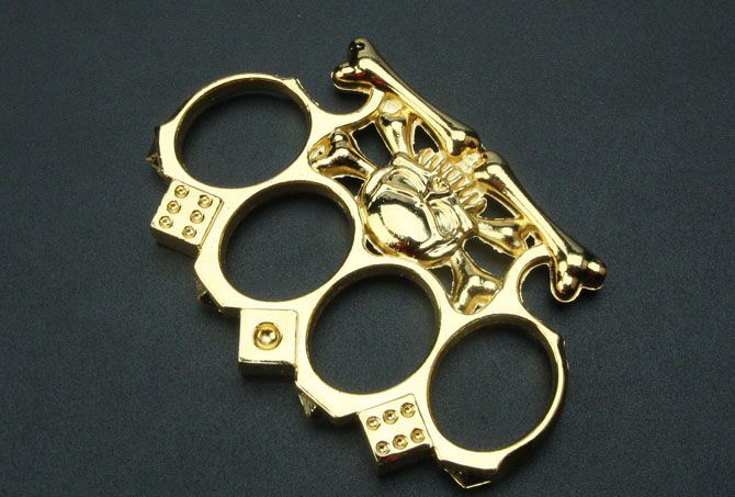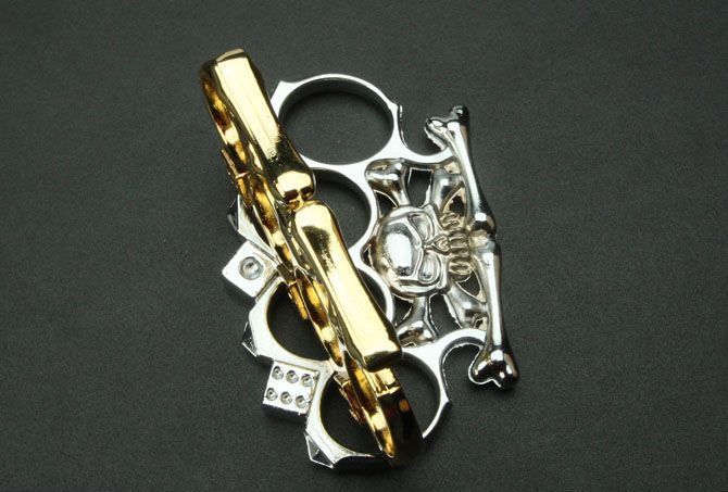 色子骷髅拳套(金色/白色) 全长:11cm 刃厚:6.7mm 刃宽:7.3cm 材质:铸铁 净重:140克 表面处理:电镀黄色和白色 购买时请注明具体的产品颜色。