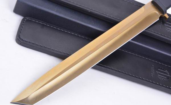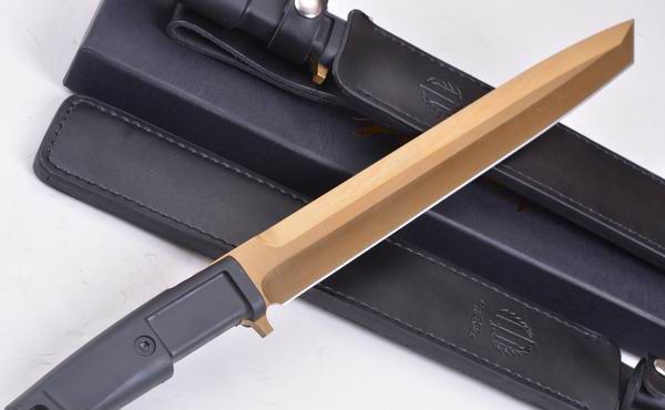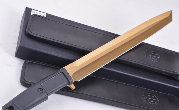 极端武力TY18直刀 全 长:440mm 刃 长:300mm 柄 长:130mm 刃 宽:40mm 刃 厚:6.4mm 刃 材:5Cr13Mov 重 量:760g(含包装) 硬 度:57HRC 表 面:镀钛金 柄 材:ABS 锁 型:定锁 其 他:配皮套