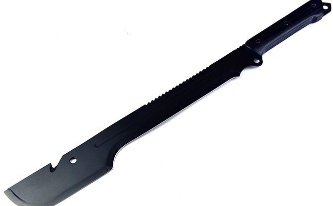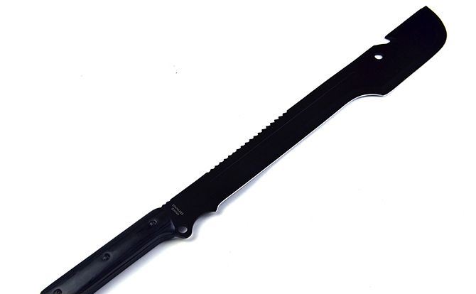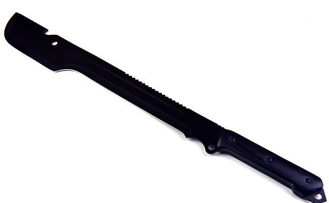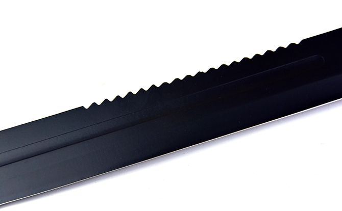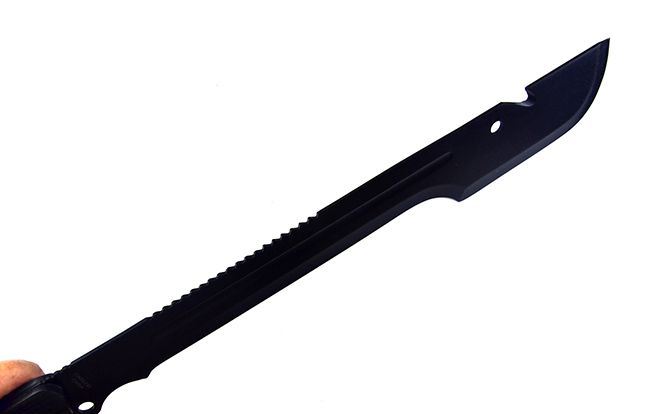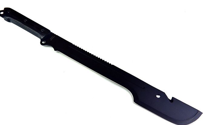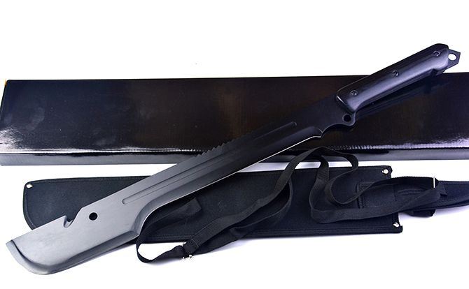 全长;63.5cm 刃长:40.5cm 柄长:17.8cm 刃宽:6.5cm 刃厚:3.9cm 刃材:440 刀柄:黑木 表面:黑氧化 重量:975G(带刀套) 配件:尼龙套+黑色纸盒