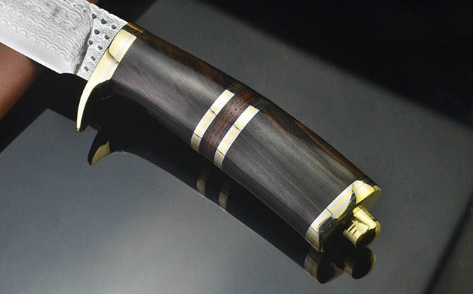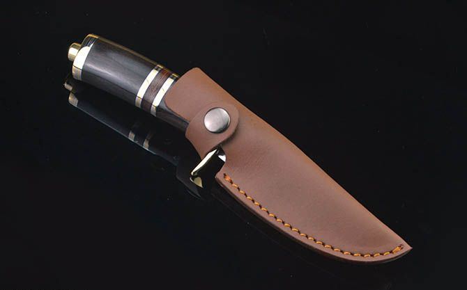 水滴纹大马士革猎刀 全 长:21.8cm 刃 长:8.8cm 柄 长:10.5cm 刃 宽:2.9cm 刃 厚:3.8mm 刃 材:水滴纹大马士革 重 量:235g(含包装) 硬 度:58HRC 表 面:水滴纹大马士革 柄 材:双铜头+黑檀木 其 他:皮套 备 注:带铜头玻璃撞