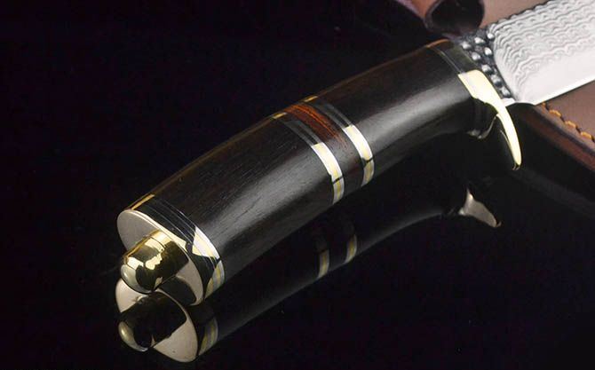 全 长:21.8cm 刃 长:8.8cm 柄 长:10.5cm 刃 宽:2.9cm 刃 厚:3.8mm 刃 材:水滴纹大马士革 重 量:235g(含包装) 硬 度:58HRC 表 面:水滴纹大马士革 柄 材:双铜头+黑檀木 其 他:皮套 备 注:带铜头玻璃撞
