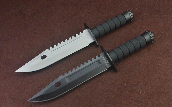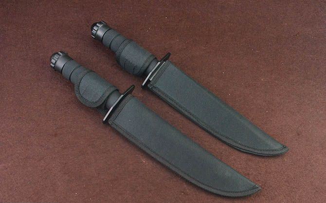 新款D80军刀(黑、白) 全长:32.5cm 刃长:18.5cm 柄长:12.5cm 刃厚:4.2mm 刃宽:4cm 刃材:3CR13钢 表面处理:电泳黑/喷灰砂 柄材:ABS塑料 硬度:56 重量:433克(含包装) 包装:尼龙套 备注:手柄内带超强玻璃锥