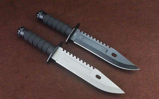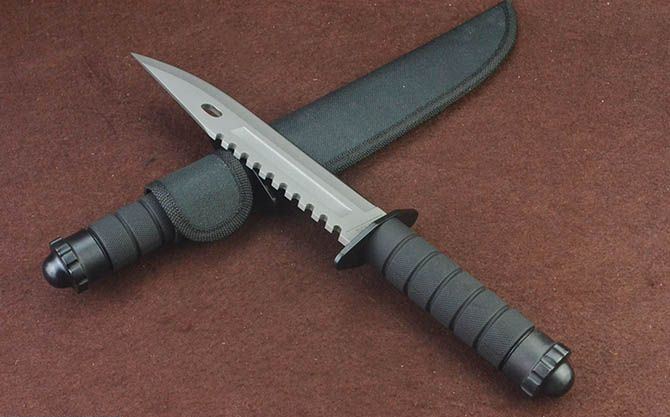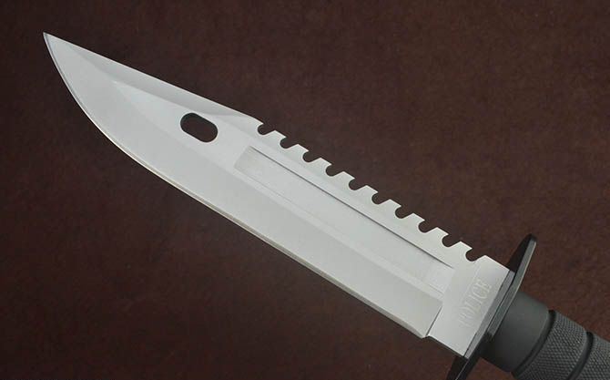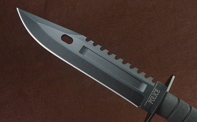 全长:32.5cm 刃长:18.5cm 柄长:12.5cm 刃厚:4.2mm 刃宽:4cm 刃材:3CR13钢 表面处理:电泳黑/喷灰砂 柄材:ABS塑料 硬度:56 重量:433克(含包装) 包装:尼龙套 备注:手柄内带超强玻璃锥