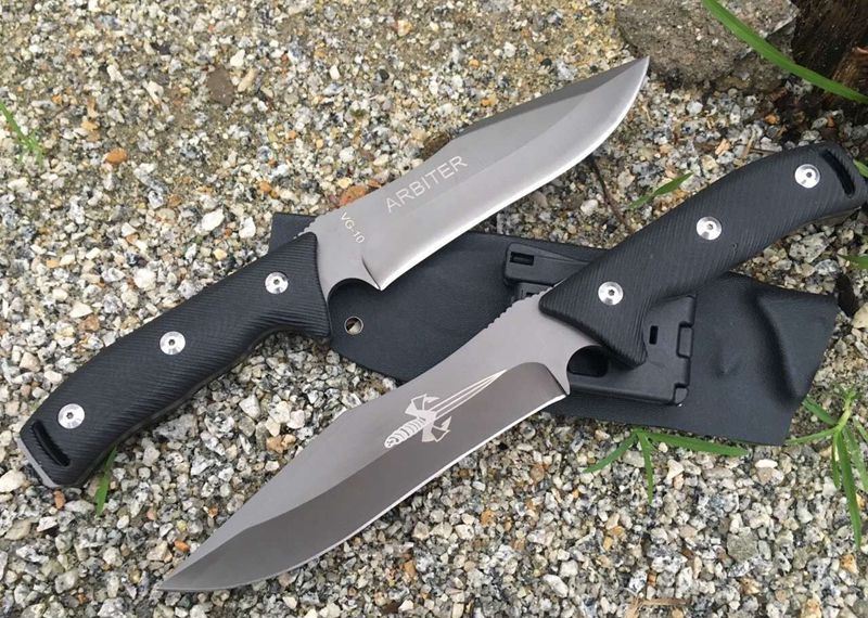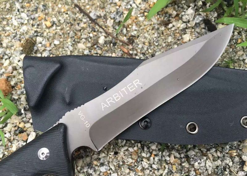 微技术仲裁者直刀 全长:30cm 刃宽:4cm 刃长:17cm 刃厚:6mm 钢材:VG-10 硬度:59HRC 表面:枪钛 手柄:G10 刀套了k鞘带背夹