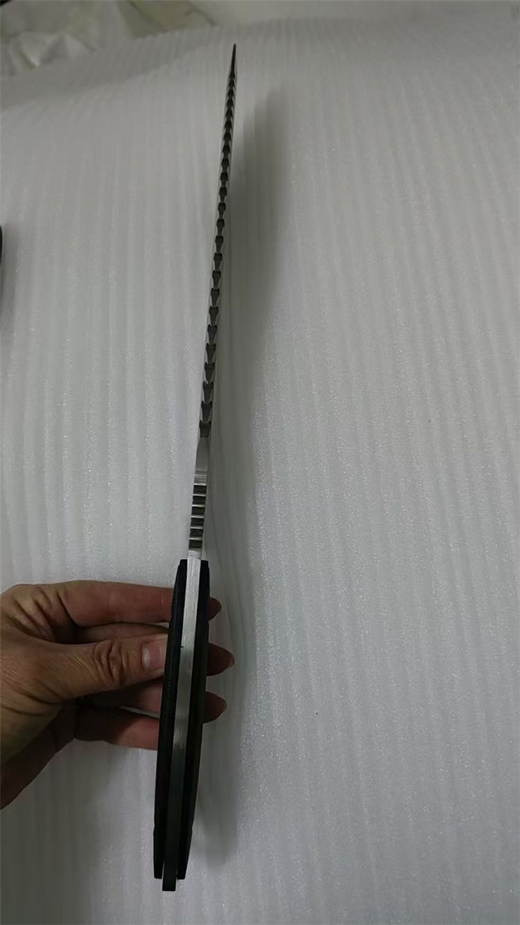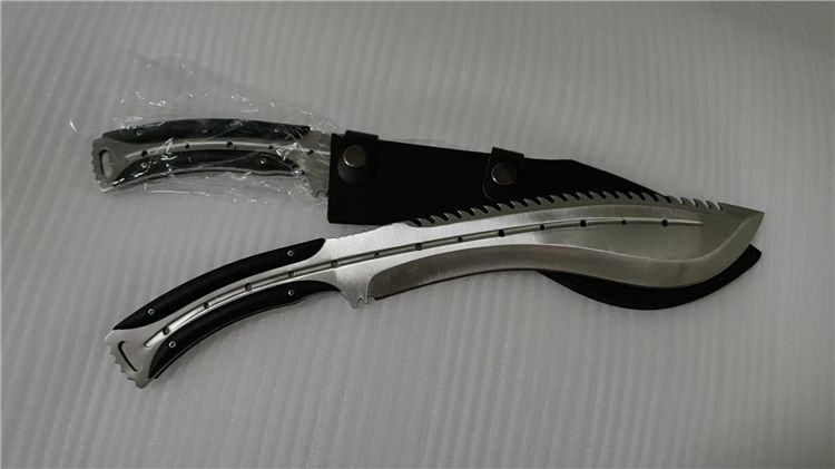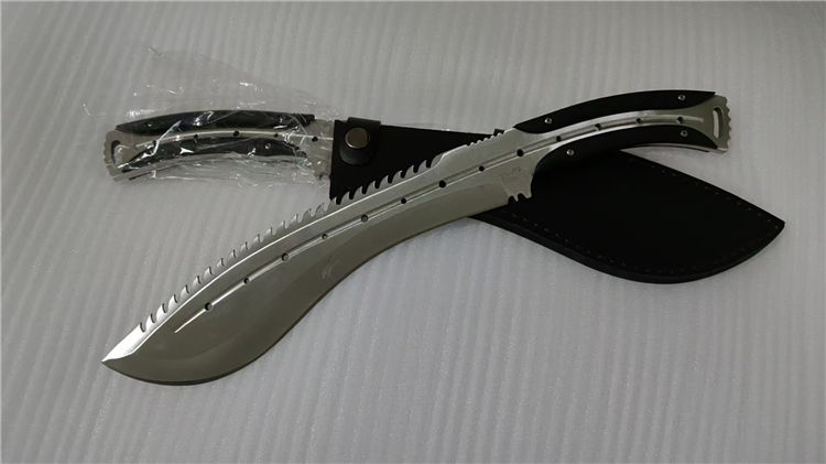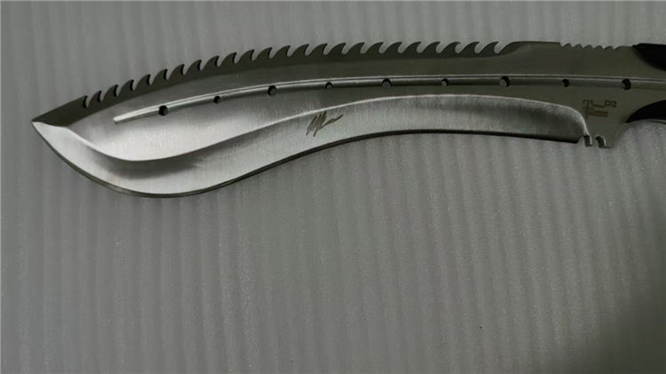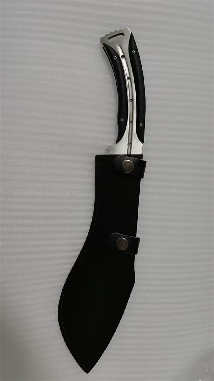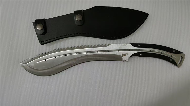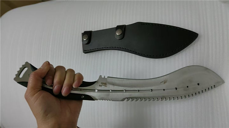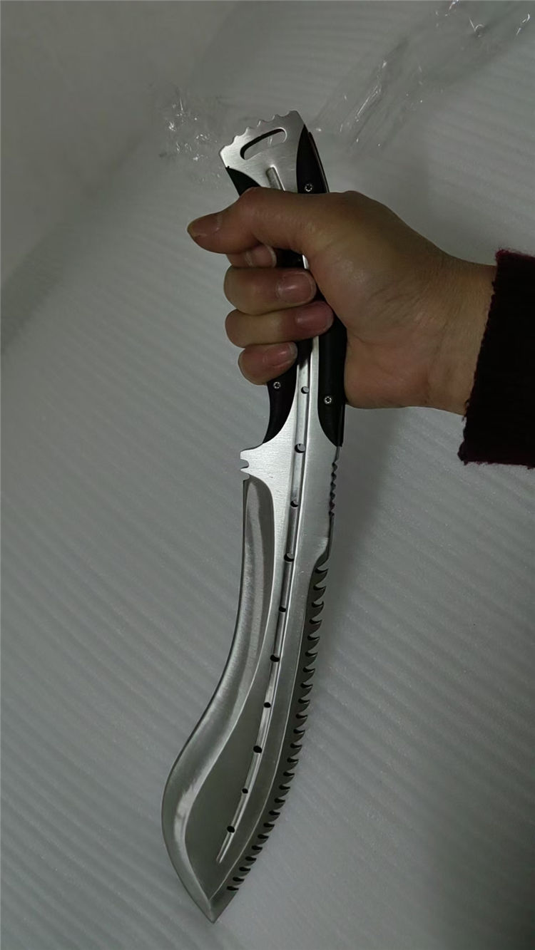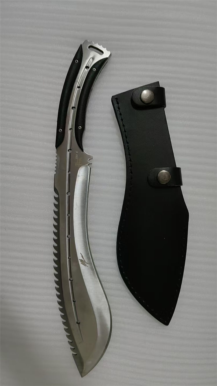大号托德恶龙背齿狗腿刀砂光 全 长:39cm 刃 长:24cm 刃 宽:6cm(最宽处) 刃 厚:6.2mm 柄 长:13cm 表 面: 砂光 刃 材: 5Cr15 硬 度: 58HRC 柄 材: G10防滑柄片 结 构:龙骨一体贯穿整体 重 量:800克(含包装) 包 装:皮套+彩盒