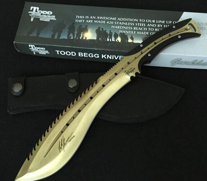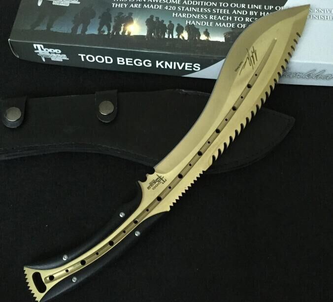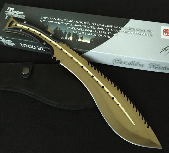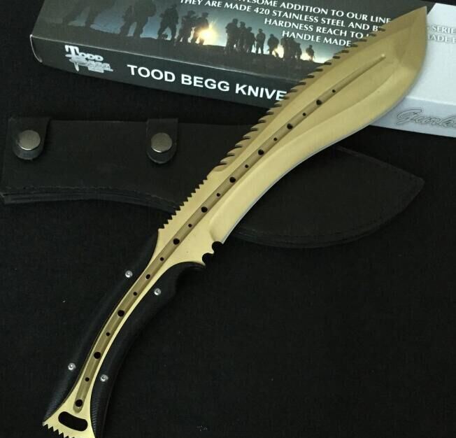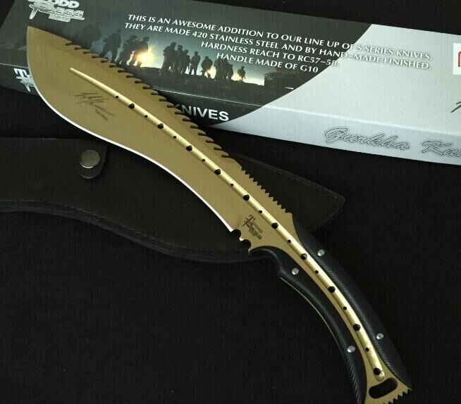 大号托德恶龙黄金背齿狗腿刀 全 长:39cm 刃 长:24cm 刃 宽:6cm(最宽处) 刃 厚:6.2mm 柄 长:13cm 表 面: 镀金 刃 材: 5Cr15 硬 度: 58HRC 柄 材: G10防滑柄片 结 构:龙骨一体贯穿整体 重 量:800克(含包装) 包 装:皮套+彩盒