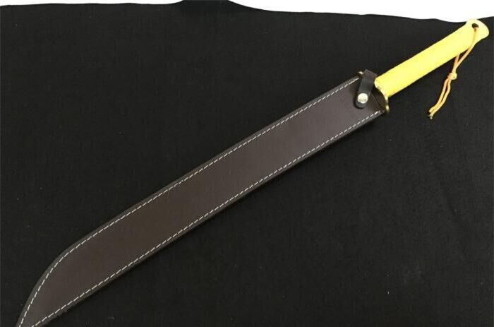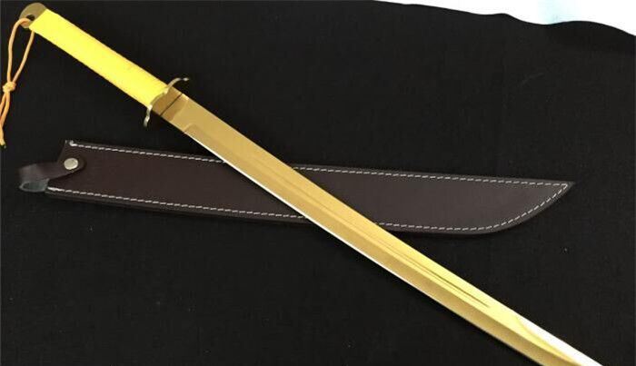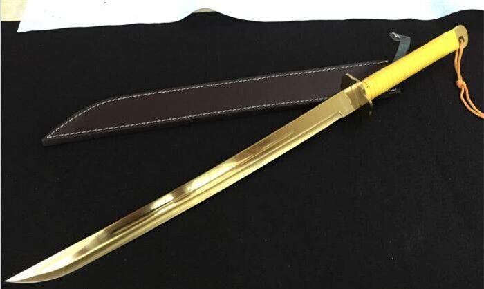 全长:73cm 刃长:49.5cm 柄长:22.5cm 刃厚:6mm 刃宽:3.7cm 刃材:4Cr14 硬度:57HRC 总重:1500克(含包装) 刀鞘;真皮套 包装:纸盒 表面处理:镀金