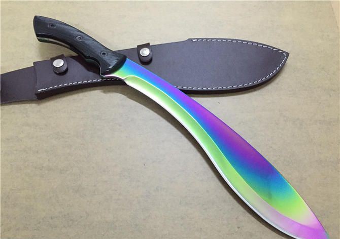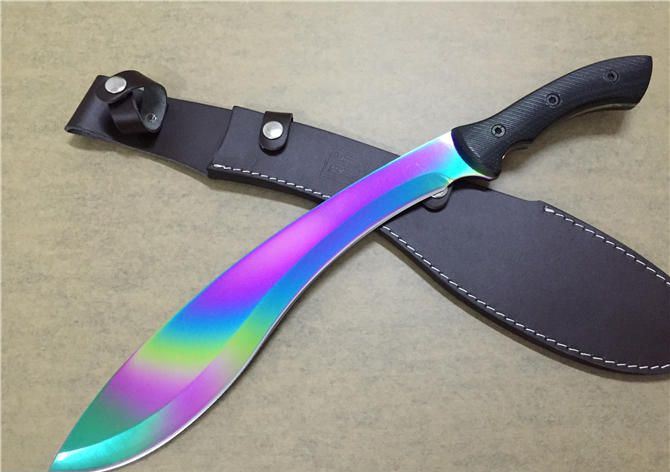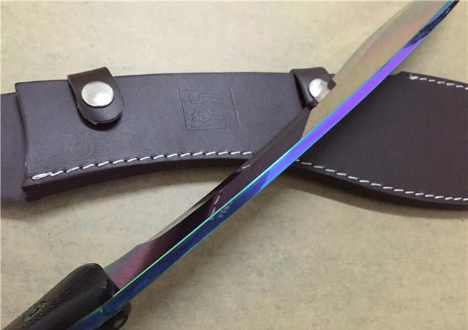 刀奴太阳神狗腿弯刀彩钛版 全 长:50cm 刃 长:35cm 柄 长:15cm 刃 厚:5.3mm 刃 宽: 6.4cm 刃 材: 5Cr15Wov 表 面:彩钛 柄 材: G10 硬 度: 58HRC 净 重:900g(含皮套) 重 量:1100克(含包装物)