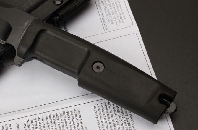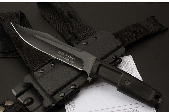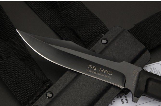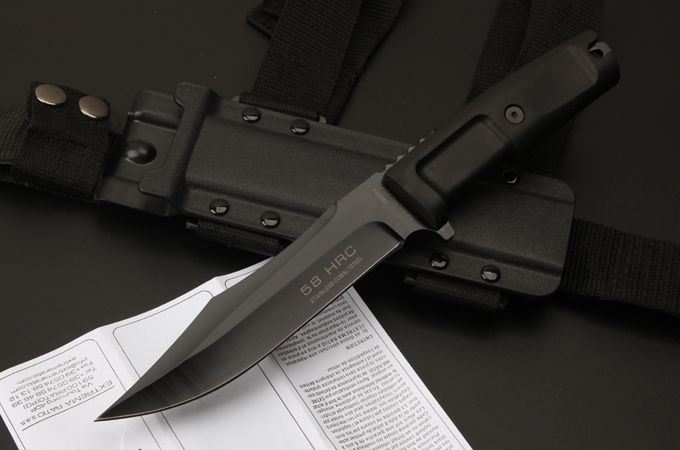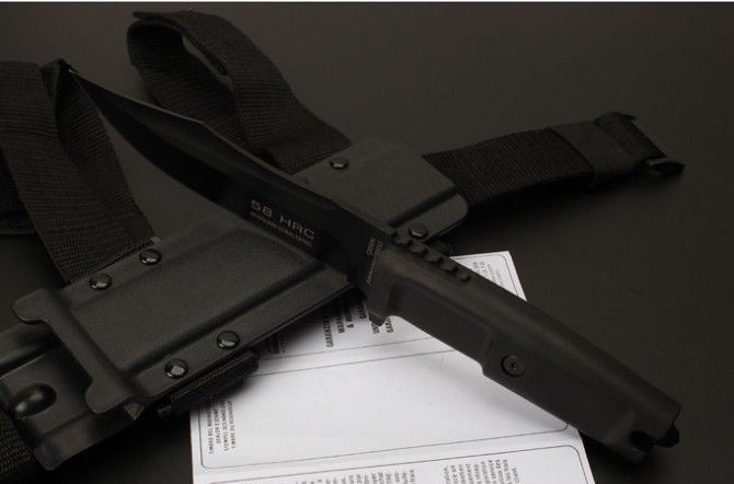 刀刃材质:N690 全长:30.5CM 刃长:18CM 刃厚:0.5CM 刃宽:3.2CM 硬度:58HRC 柄材热塑性弹性橡胶 刀鞘:黑色尼龙战术绑腿刀鞘 重量:288克