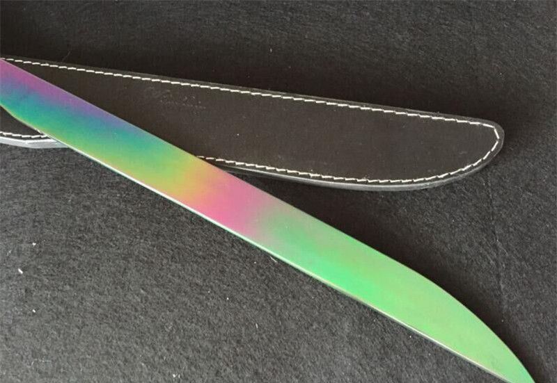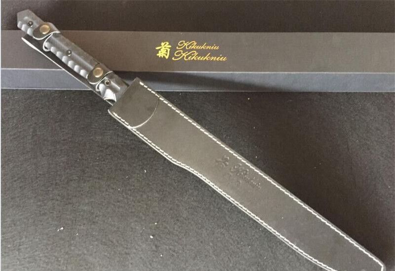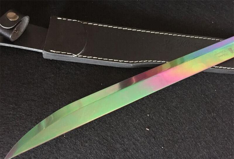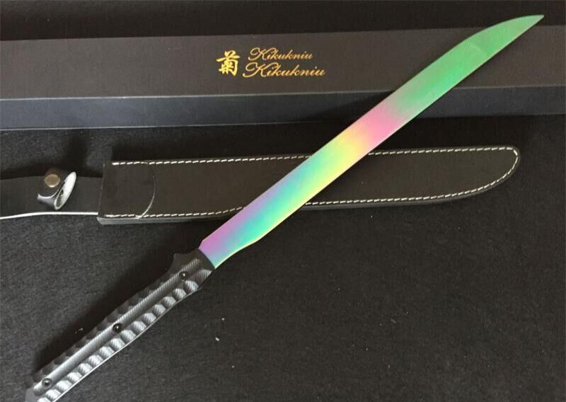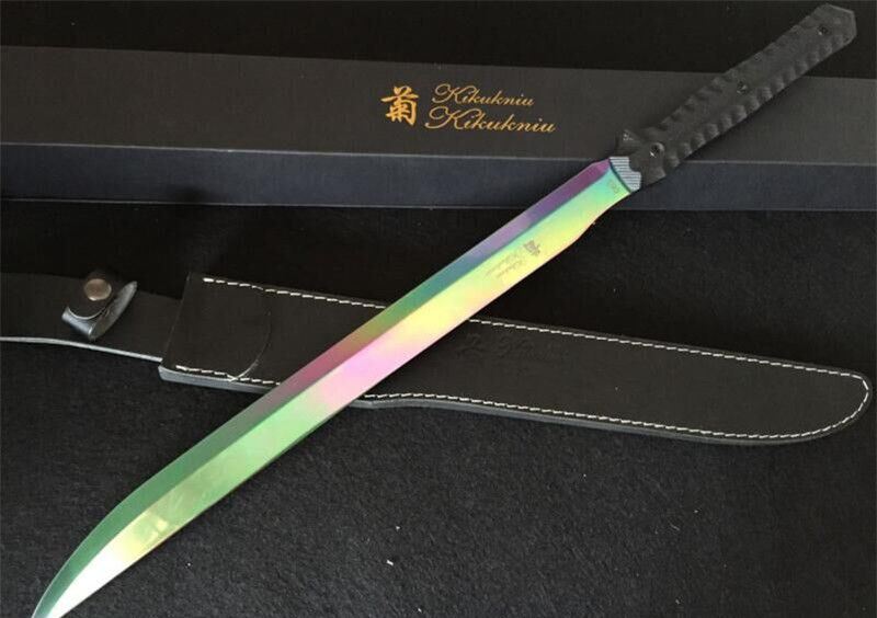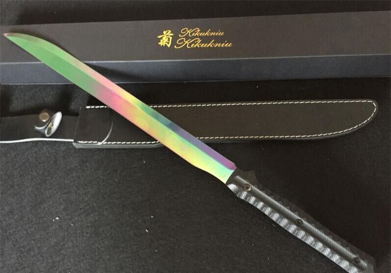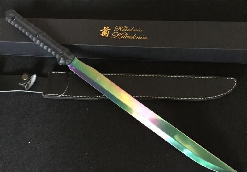 菊男彩虹版长刀 全 长:680mm 刃 长:450mm 柄 长:223mm 刃 宽:37mm 刃 厚:5.5mm 刃 材:5Cr13Wov 重 量:1320g(含包装) 硬 度:59HRC 表 面:镀彩钛 柄 材:G10 锁 型:定锁 其 他:配皮套