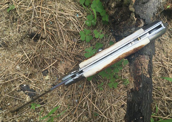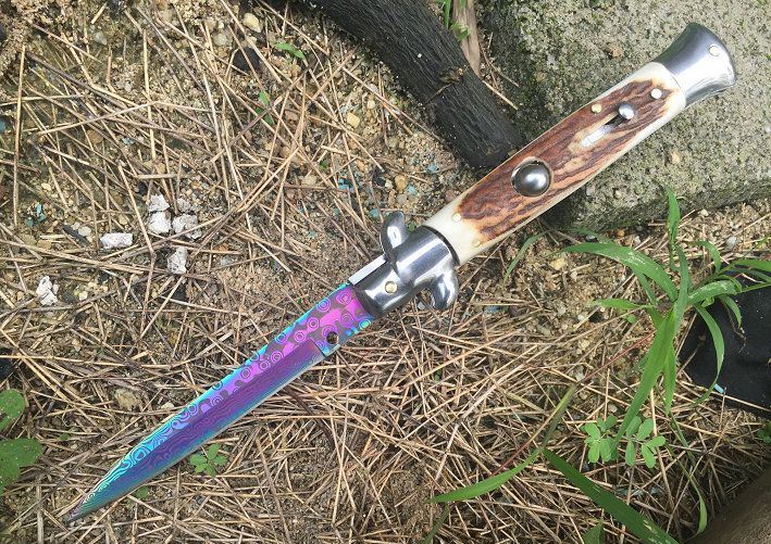 9寸意大利鹿角跳刀彩钛大马士革枪刺刃 全 长:22.9mm 刃 长:10.2mm 柄 长:13cm 刃 宽:1.2cm(最宽处) 刃 厚:3.0mm 刃 材:大马士革刃 刀 柄:天然鹿角 开刀方式:弹簧 重 量:135克 包 装:纸盒 意大利黑手党使用的经典刀具-赌徒跳刀,在电影"教父"里出尽了风头!大马士革刃的黑手党侧跳,弹力超强,锁定到位,大马士革枪刺刃(水波纹),带有保险装置,刀护手处暗藏闭合开关,出口产品,质量保证!满足把玩和收藏需要