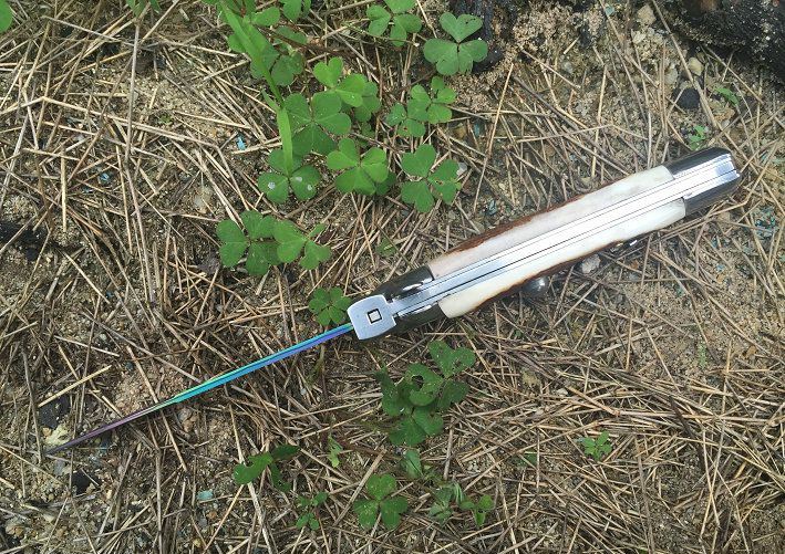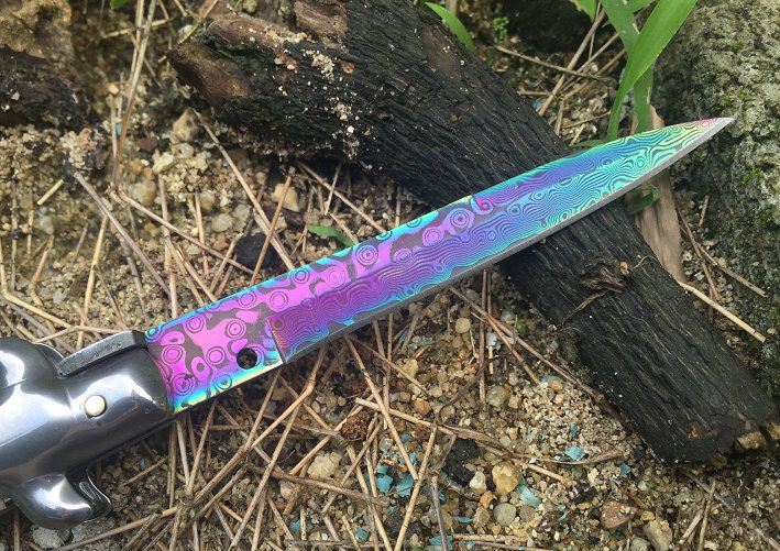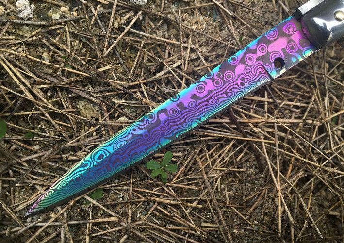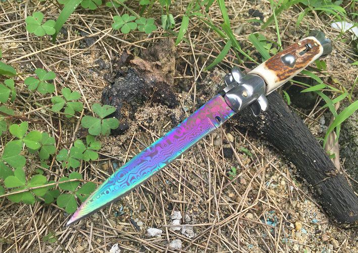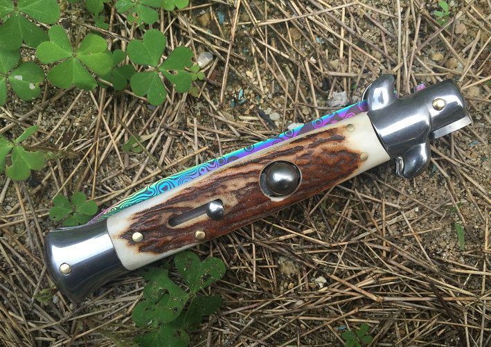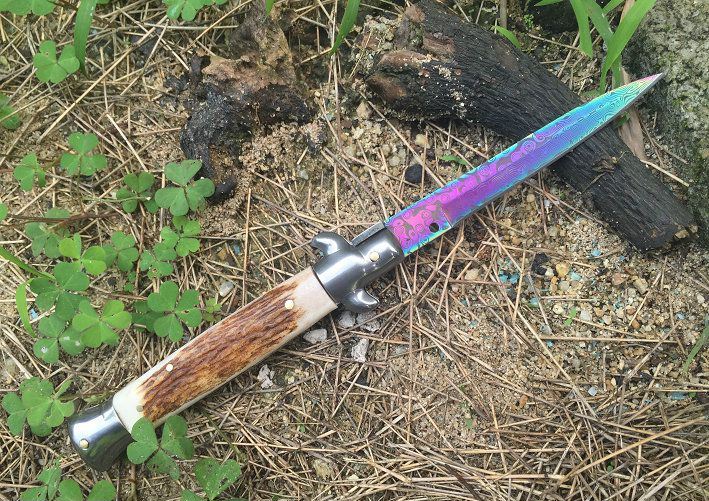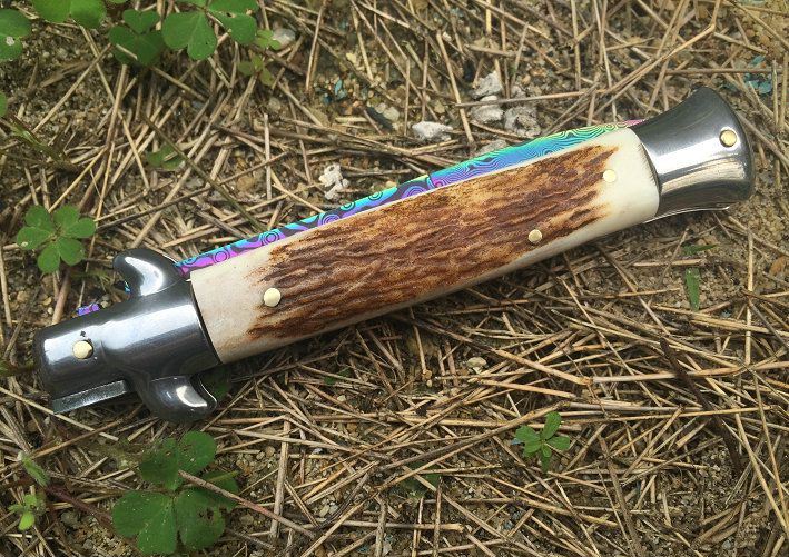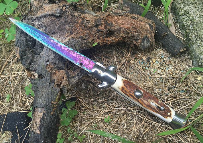 9寸意大利鹿角跳刀彩钛大马士革枪刺刃