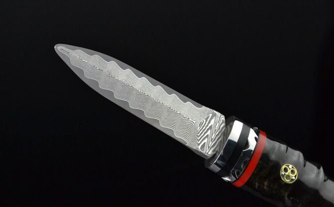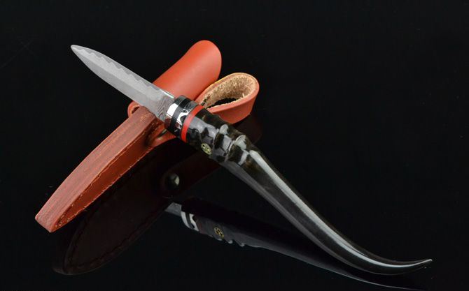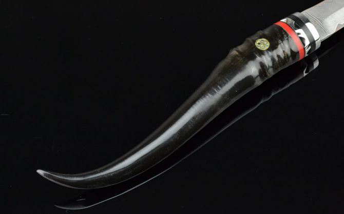 全 长: 19.3cm 刃 长: 5.9cm 柄 长: 13.3cm 刃 宽: 1.6cm(最宽处) 硬 度: 59HRC 刃 厚: 0.22cm 柄 材: 原只黑羊角 重 量: 66克(含皮套) 刃 材: 进口大马士革钢 表 面: 大马士革钢特有的花纹原色 其 他: 半开刃,真皮套 大马士革钢花纹和把手柄形状各异,以实物为准!
