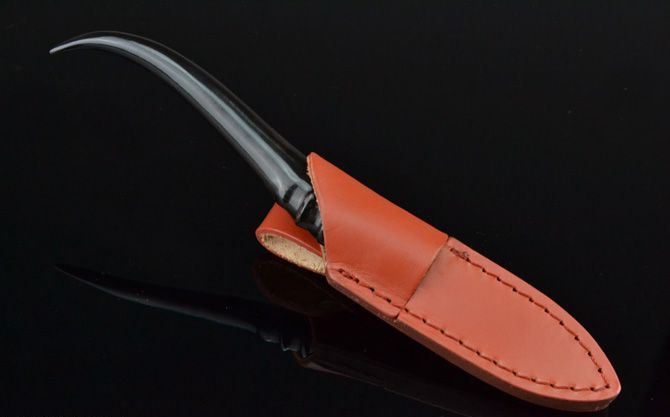 黑羊角大马士革茶叶刀 全 长: 19.3cm 刃 长: 5.9cm 柄 长: 13.3cm 刃 宽: 1.6cm(最宽处) 硬 度: 59HRC 刃 厚: 0.22cm 柄 材: 原只黑羊角 重 量: 66克(含皮套) 刃 材: 进口大马士革钢 表 面: 大马士革钢特有的花纹原色 其 他: 半开刃,真皮套 大马士革钢花纹和把手柄形状各异,以实物为准!