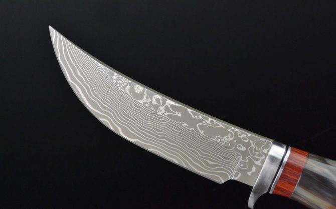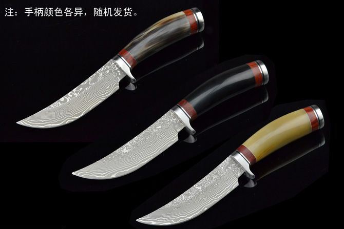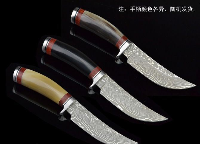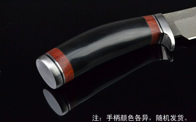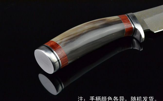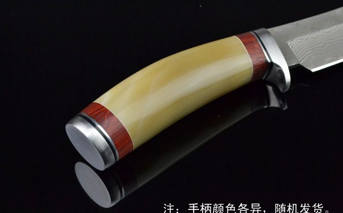 全 长: 21.5cm 刃 长: 11cm 柄 长: 10cm 刃 宽: 2.8cm(最宽处) 硬 度: 59HRC 刃 厚: 0.32cm 柄 材: 天生原只花牛角,比较少有的哦! 重 量: 239克(含包装) 刃 材: 大马士革钢 表 面: 大马士革钢特有的花纹原色 包 装:皮鞘 其 他: 大马士革钢花纹和花牛角手柄颜色各异,以实物为准!