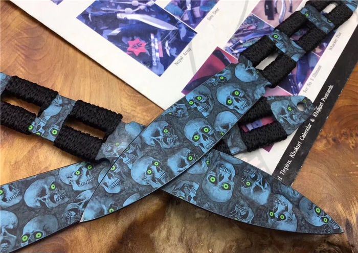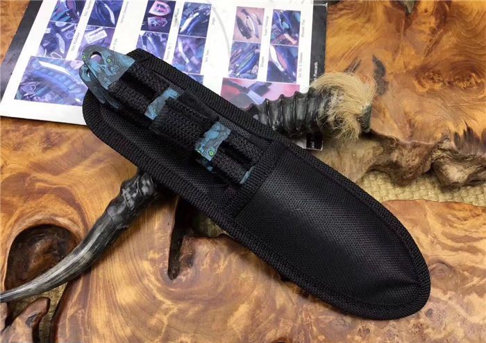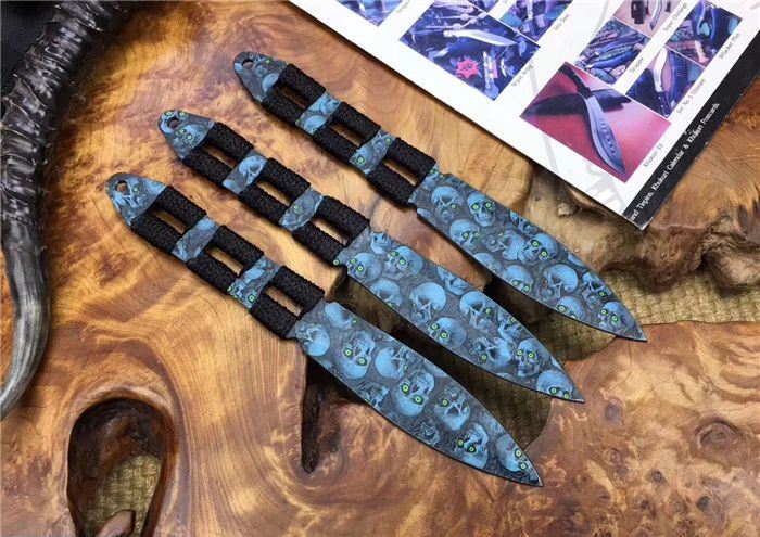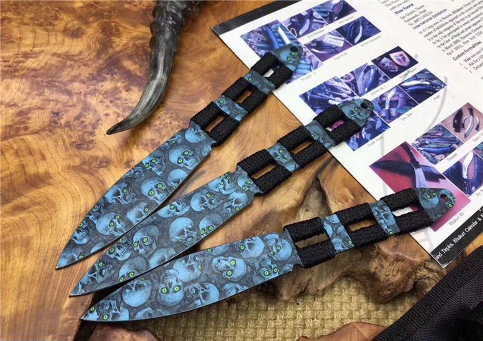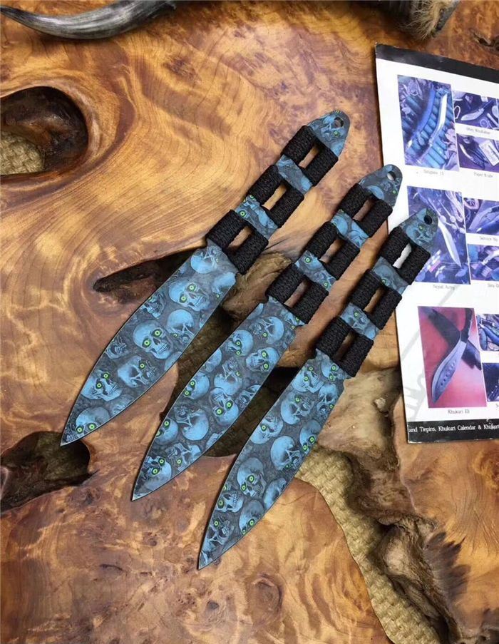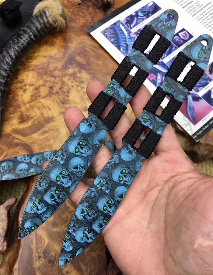 骷髅幽灵飞镖三支装 全 长:20.5 CM 刃 长:10CM 刃 厚:0.25CM 柄 材:一体缠绳子 刃 材:3Cr13 表 面:披履 毛 重:200克(含尼龙鞘) 刀 鞘:尼龙