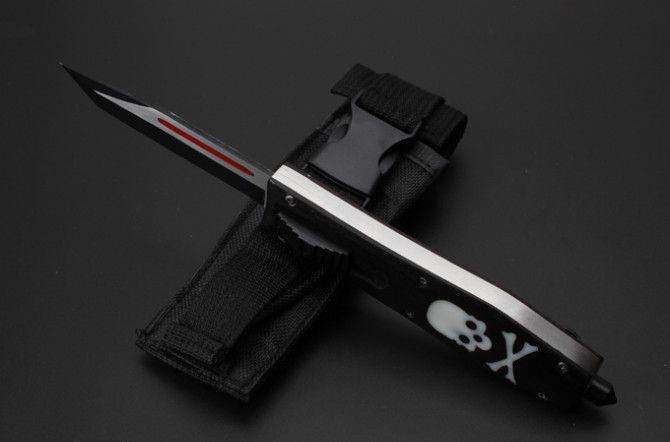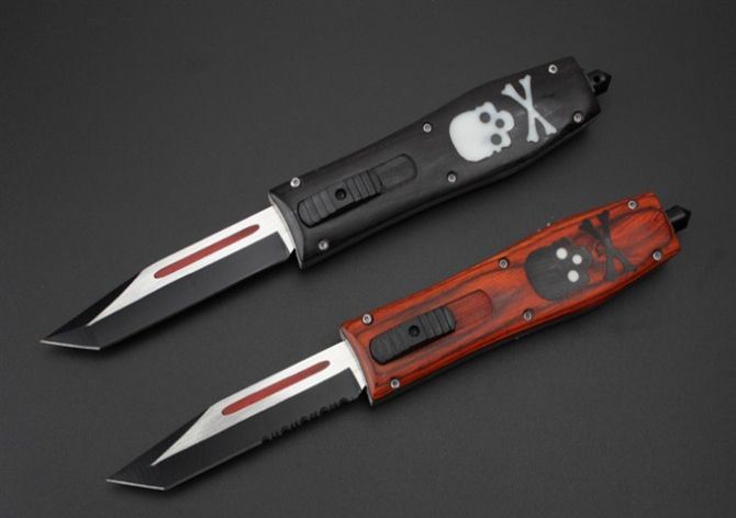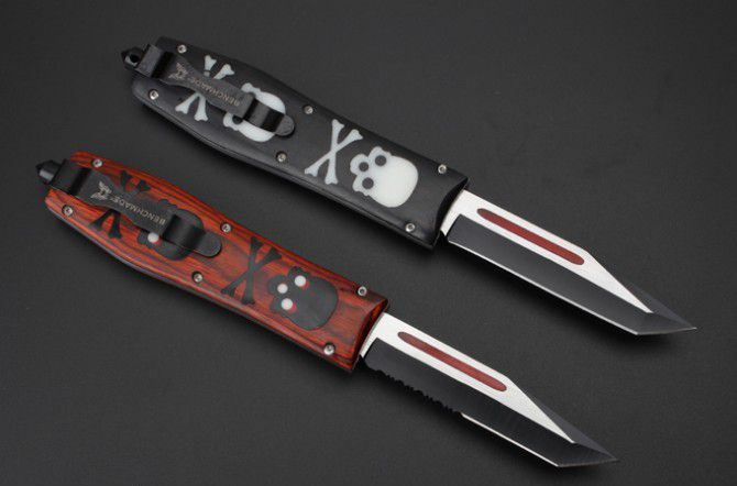 新版猛兽蝴蝶跳刀 全 长:22.9cm 刃 长:9.7cm 刃 厚:1.6mm 刃 材:D2 硬 度:59HRC 刀 重:188g 毛 重:266g 表 面:镀钛 柄 材:锌铝合金+黑檀木 刀 鞘:尼龙 锁 闭:直出弹簧刀 备 注:红柄平头半齿、黑色平头全刃