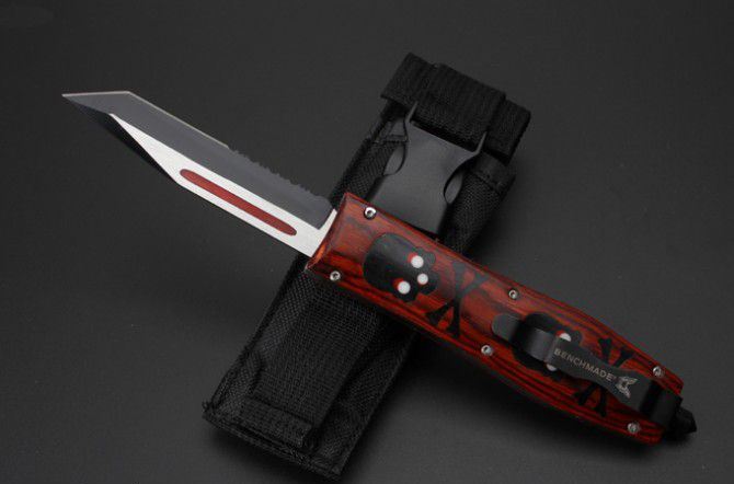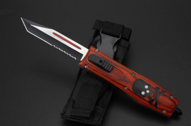 全 长:22.9cm 刃 长:9.7cm 刃 厚:1.6mm 刃 材:D2 硬 度:59HRC 刀 重:188g 毛 重:266g 表 面:镀钛 柄 材:锌铝合金+黑檀木 刀 鞘:尼龙 锁 闭:直出弹簧刀 备 注:红柄平头半齿、黑色平头全刃