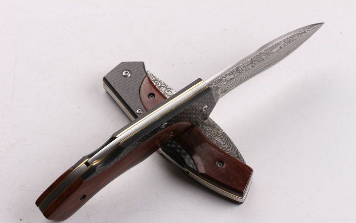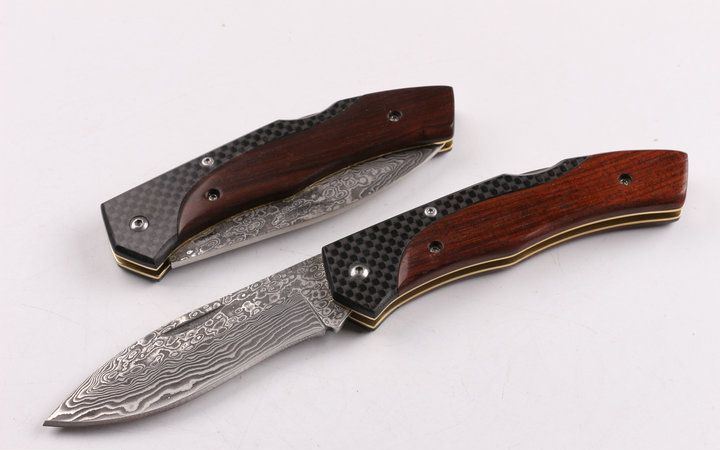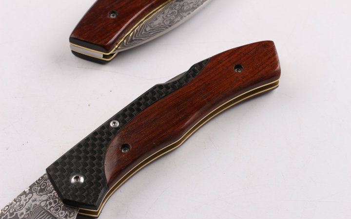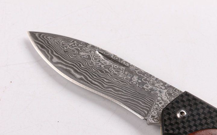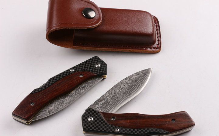 土狼大马士革折刀 全 长:200mm 刃 长:85mm 柄 长:112mm 刃 宽:23mm 刃 厚:2.7mm 刃 材:日本大马士革钢 重 量:150g (含包装) 硬 度:58-60HRC 表 面:大马士革原有花纹 柄 材:碳纤+钛金钢片+天然红檀手柄,木纹纹路清楚 锁 型:背锁 其 它;真皮套