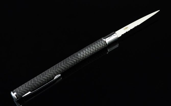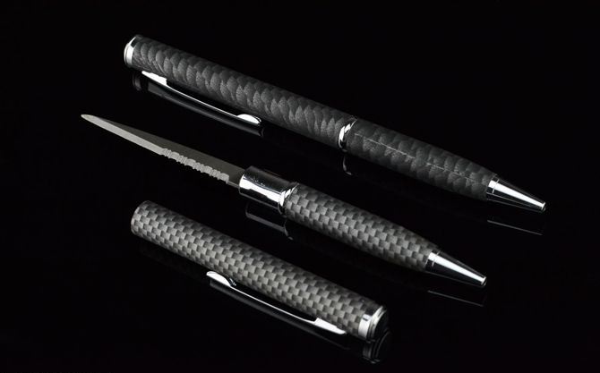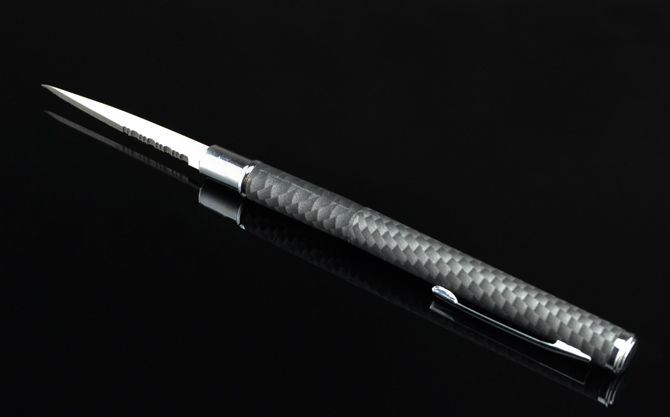 碳纤管多功能圆珠笔刀 总长:13.5cm 刃长:5.8cm 刃厚:1.2cm 刃宽:0.7cm 表面:碳纤+迷彩色 重量:17克 巧妙地将圆珠笔和小刀功能组合成一体,小巧便携,是理想的防卫工具,笔杆采用薄铜管,披覆碳纤迷彩,非常靓丽!