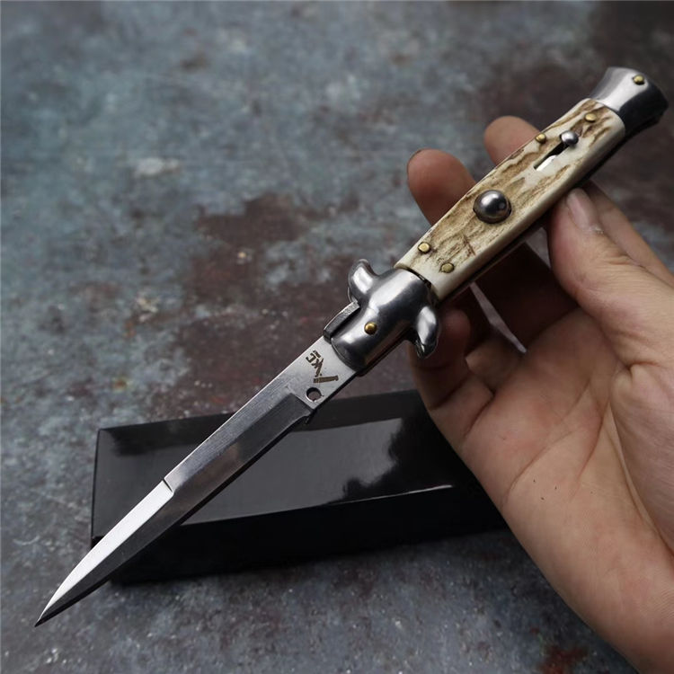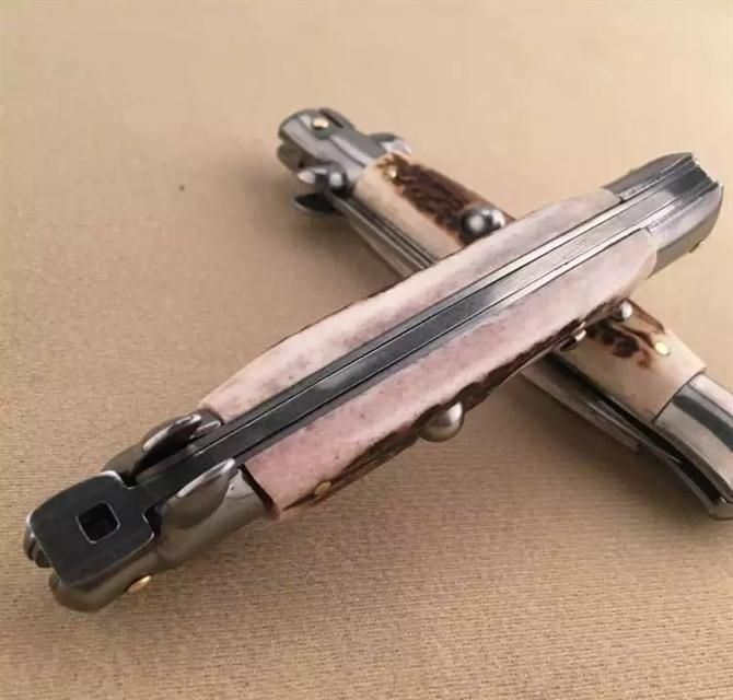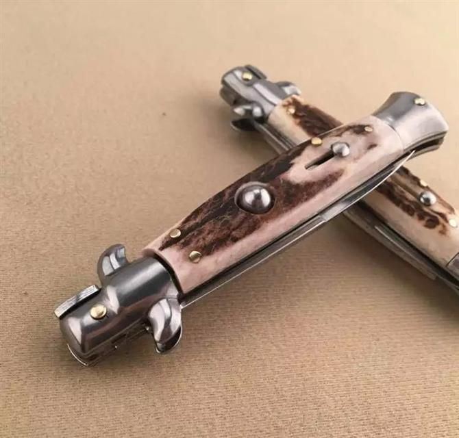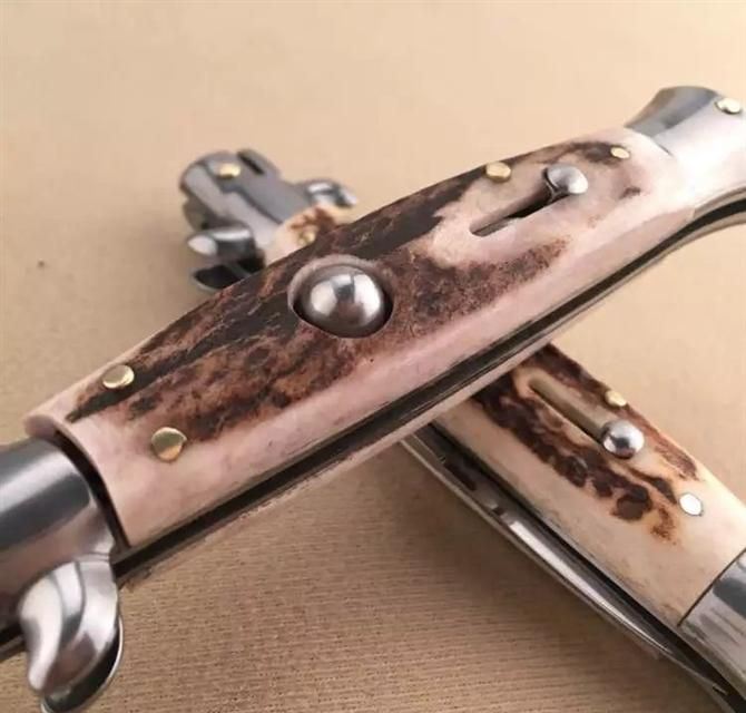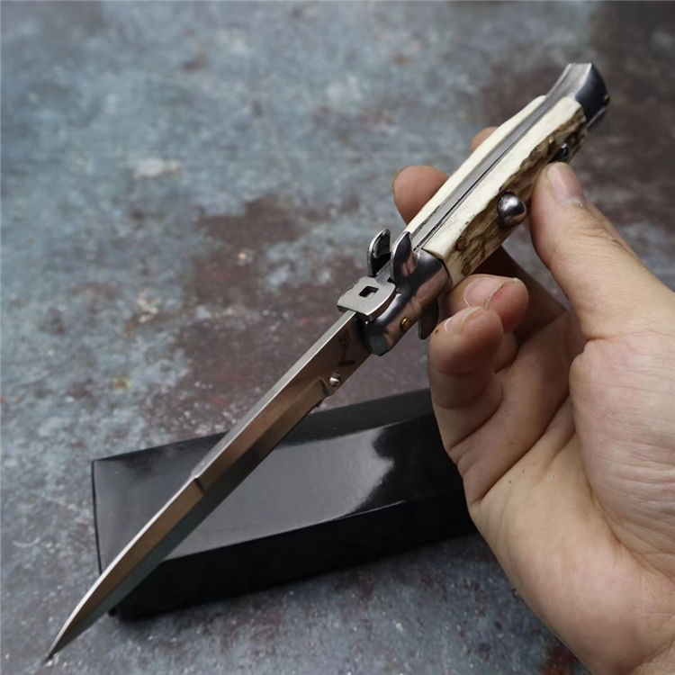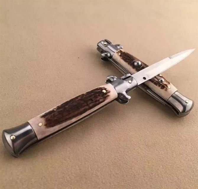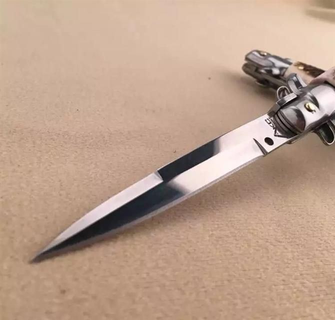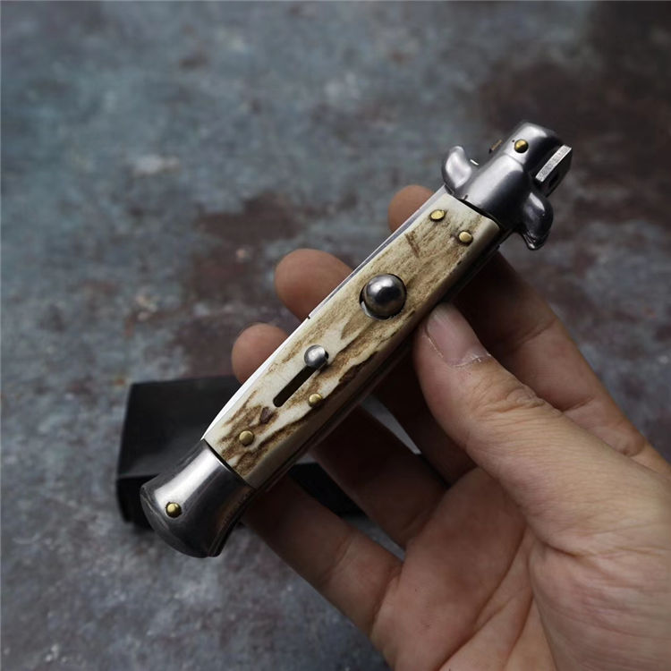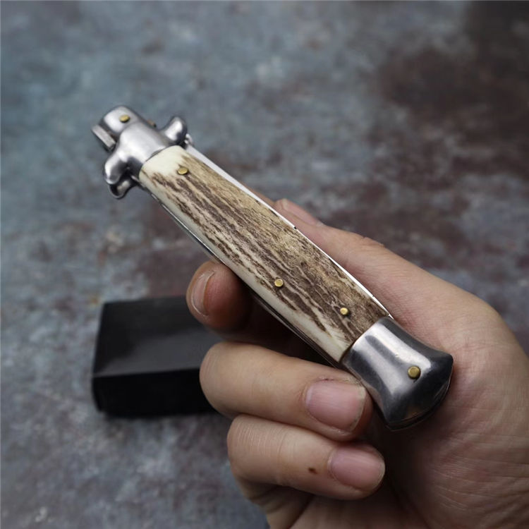 9寸AKC意大利跳刀鹿角柄(白钢) 全 长:23cm 刃 长:10cm 柄 长:13cm 刃 宽:1.3cm(最宽处) 刃 厚:3.0mm 刃 材:9cr18mov 刀 柄:原色鹿角