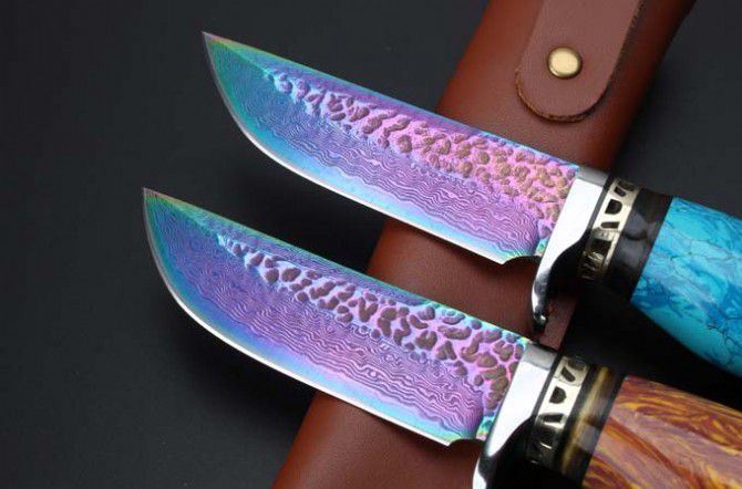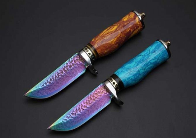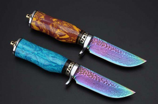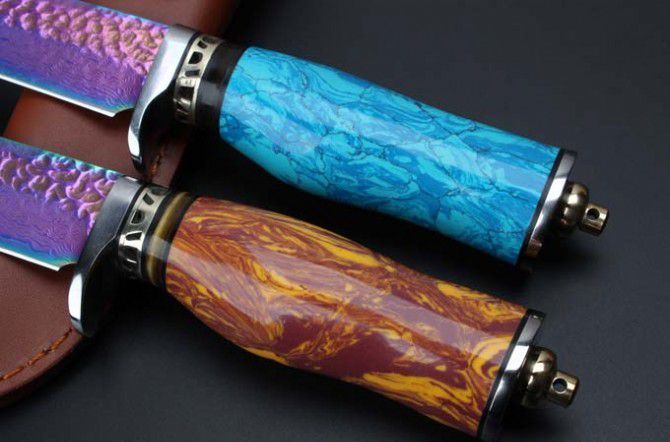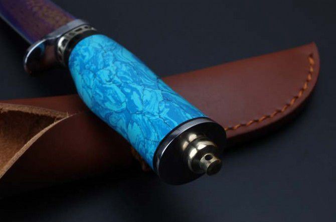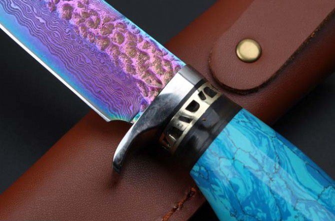 托马斯大马士革守猎刀(蓝松石、黄松石) 全 长:20.8mm 刃 长:9.4mm 柄 长:11.5mm 刃 宽:27mm左右 刃 材:大马士革 重 量:332克 硬 度:58HRC 表 面:日本进口大马士革原纹+彩钛 柄 材:纯钢头+蓝松石\黄松石 其 他:配优质牛皮套