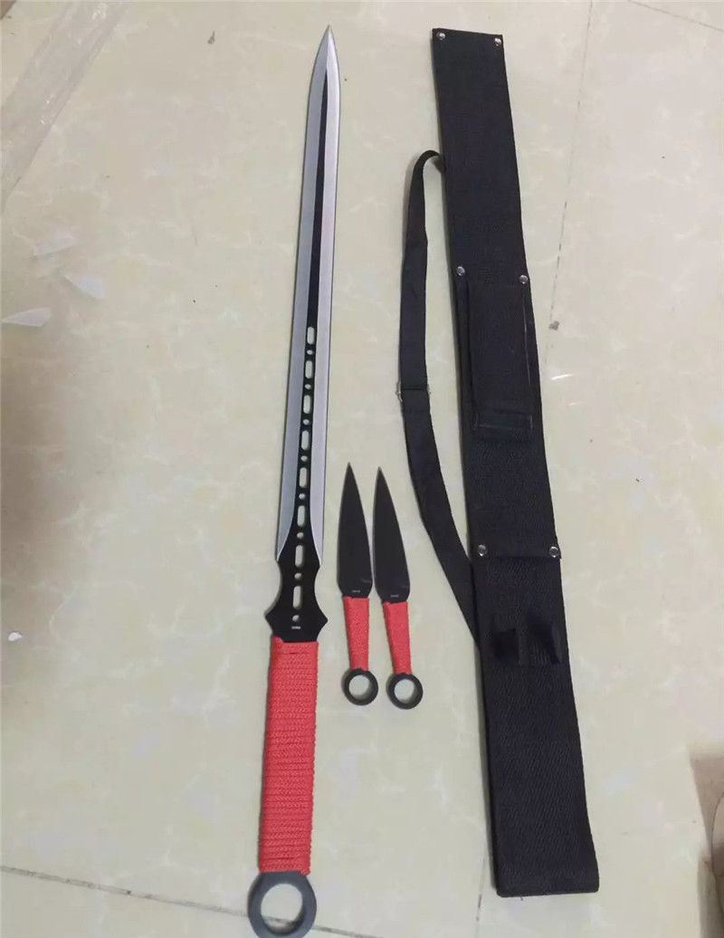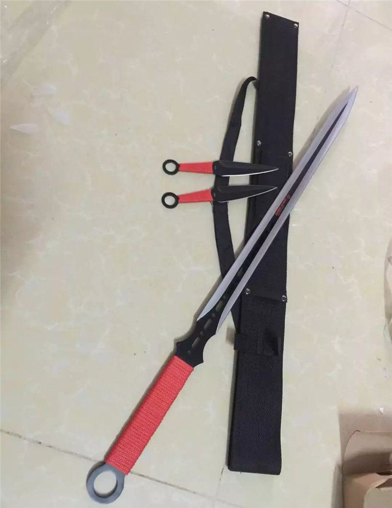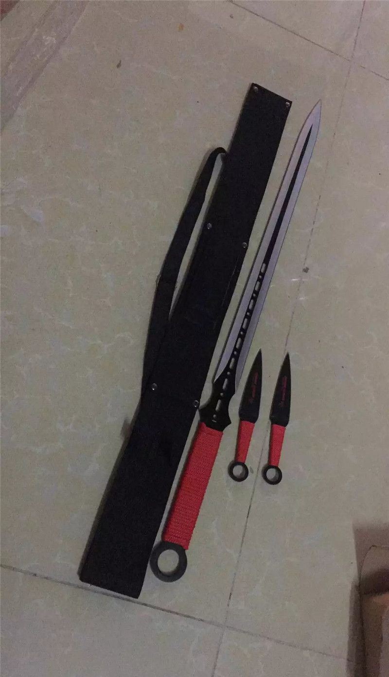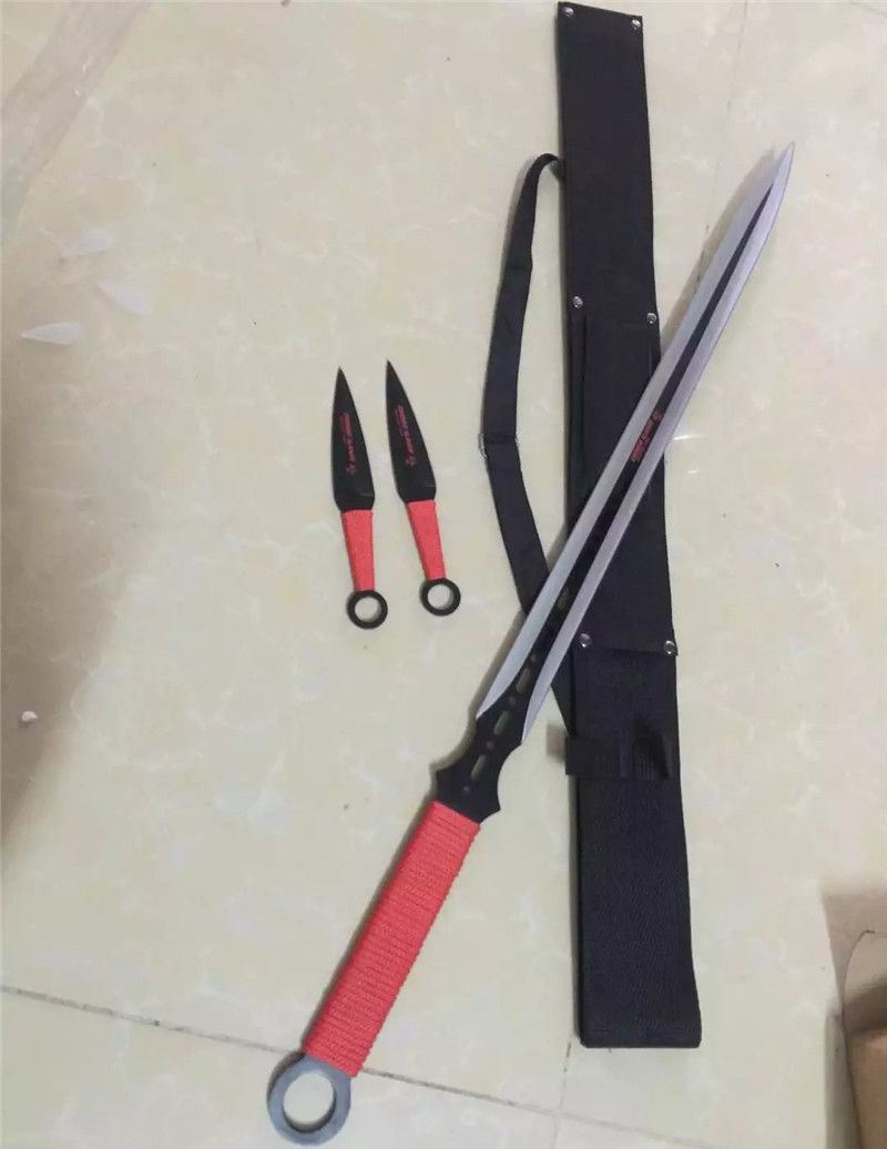 新版双镖忍者刀 全 长:68.5cm 刃 长:47cm 刃 宽:3.2cm(最宽处) 刃 厚:3mm 柄 长:16.5cm 表 面:发黑 刃 材:440 柄 材:绑绳 重 量:500克(含尼龙套、飞镖) 包 装:尼龙套