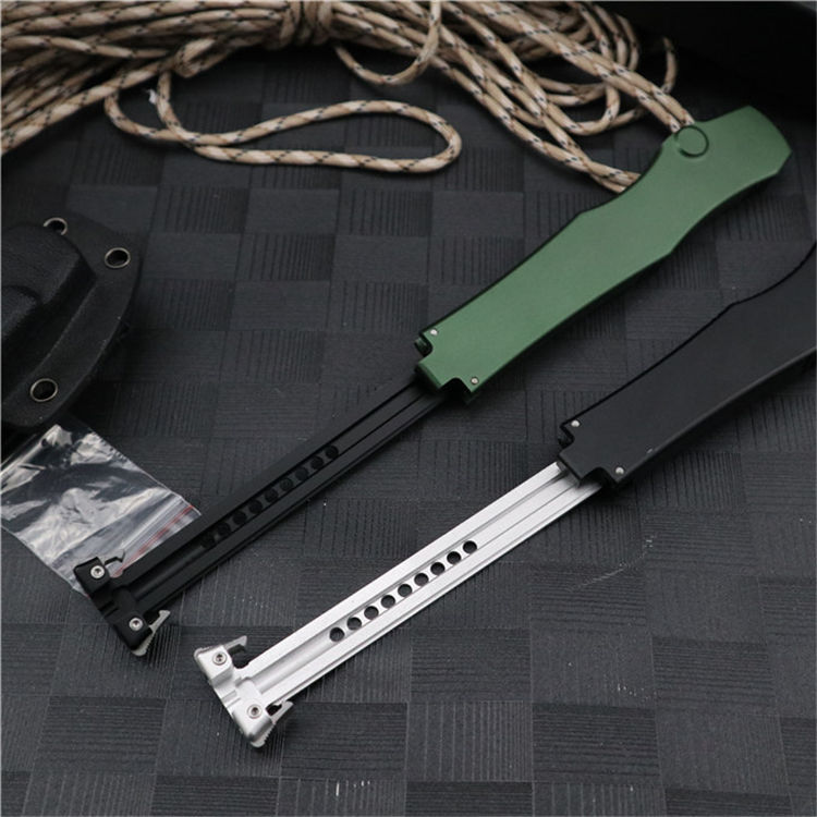 外贸版微技术150-10 HALO V超弹力直跳 全 长:27.5cm 刃 长:11.6cm 刃 厚:0.42cm 刃 宽:2.1cm 刃 材:D2 刀 型:直跳 闭合长度:15.8cm 柄 材:T6型航空铝 硬 度:60-62HRC 附 件:Kydex刀鞘,维护工具 重 量:112g Microtech在2010年MICROTECH更推出了HALO V系列弹簧刀,维持原有HALO的结实结构设计与操作方式,采用D-2工具刚作为刀身刚材