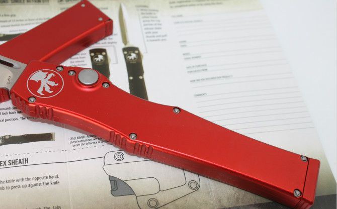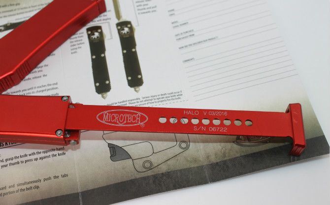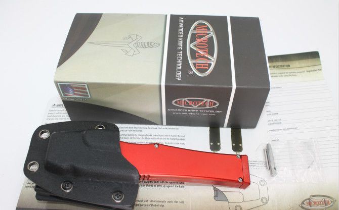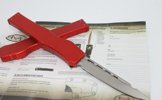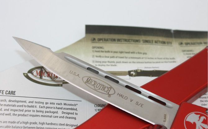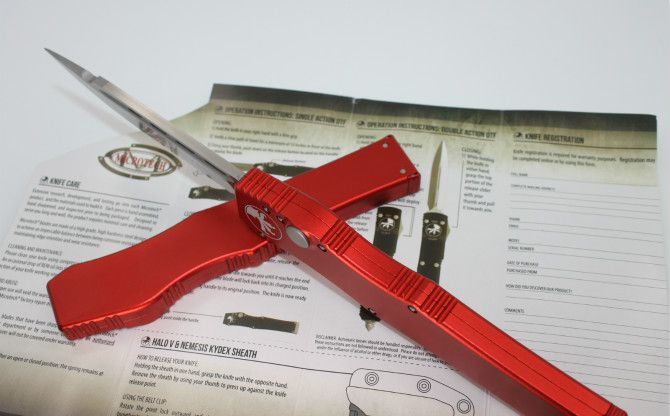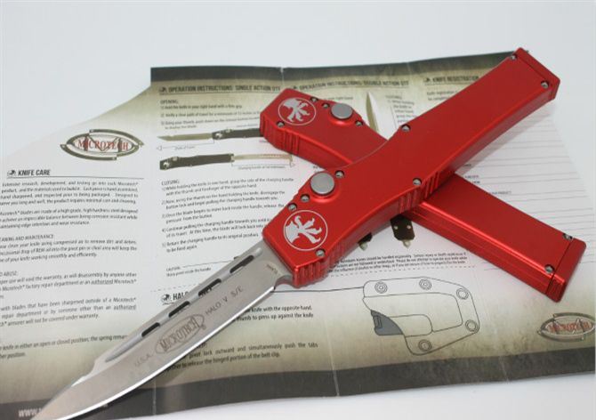 外贸版微技术150-10 HALO V超弹力直跳(红色尖头) 全 长:27.4 CM 刃 材:9cr18mov 刃 长:10.6 CM 刃 宽:1.98 CM 刃 厚:0.43 CM 柄 材:铝合金 刀 型:直跳 锁 定类型:按钮锁 重 量:148.8克 附 件:Kydex鞘,说明书,彩盒 整刀用,CNC,电脑锣,线切割制作而成,手工,精密度非常高,很值得收藏的一把刀