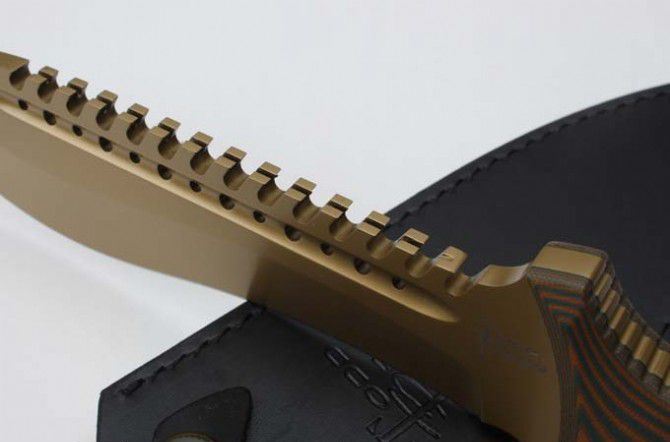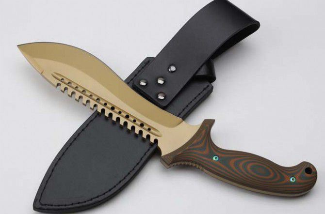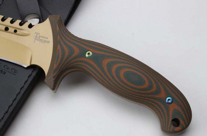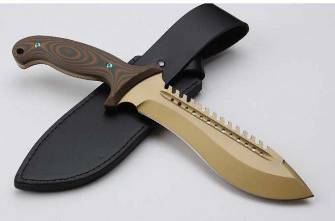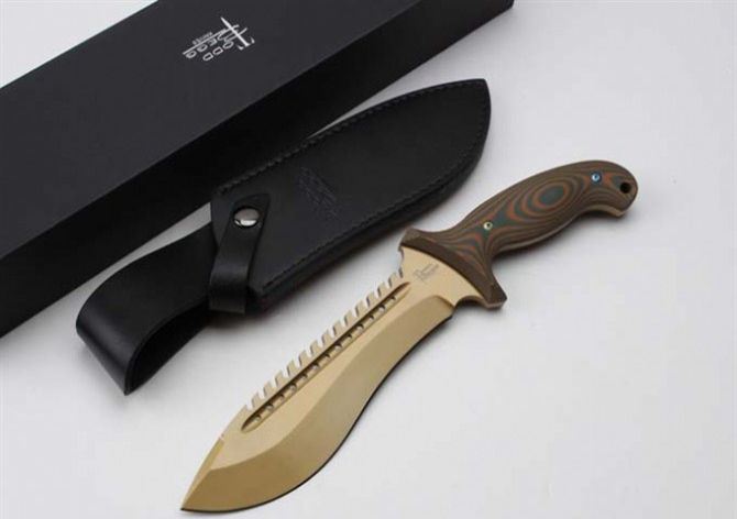 托德·贝格金刚狼狗腿刀 全 长:330mm 刃 长:185mm 柄 长:150mm 刃 宽:52mm 刃 厚:6.2mm 刃 材:9Cr18MoV 重 量:1077g (含包装物) 硬 度:58-60HRC 表 面:镀钛 柄 材:一体钢+双色G10 其 他:牛皮套