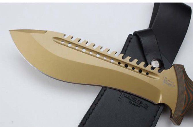 全 长:330mm 刃 长:185mm 柄 长:150mm 刃 宽:52mm 刃 厚:6.2mm 刃 材:9Cr18MoV 重 量:1077g (含包装物) 硬 度:58-60HRC 表 面:镀钛 柄 材:一体钢+双色G10 其 他:牛皮套