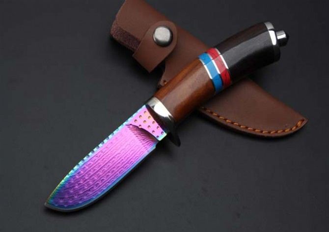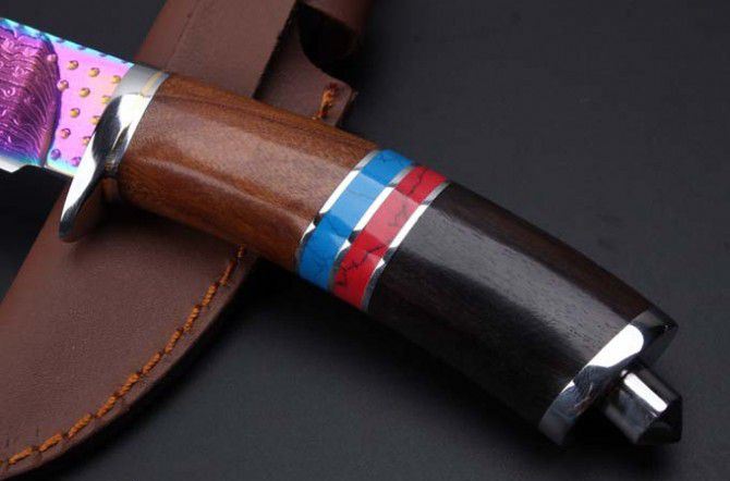 托马斯大马士革骑士彩钛刀 全 长:21.8mm 刃 长:9.8mm 柄 长:12.1mm 刃 宽:28mm左右 刃 材:大马士革 重 量:300克含包装 硬 度:58HRC 表 面:日本进口大马士革原纹+彩钛 柄 材:纯钢头+蓝松石黑檀木 其 他:配优质牛皮套