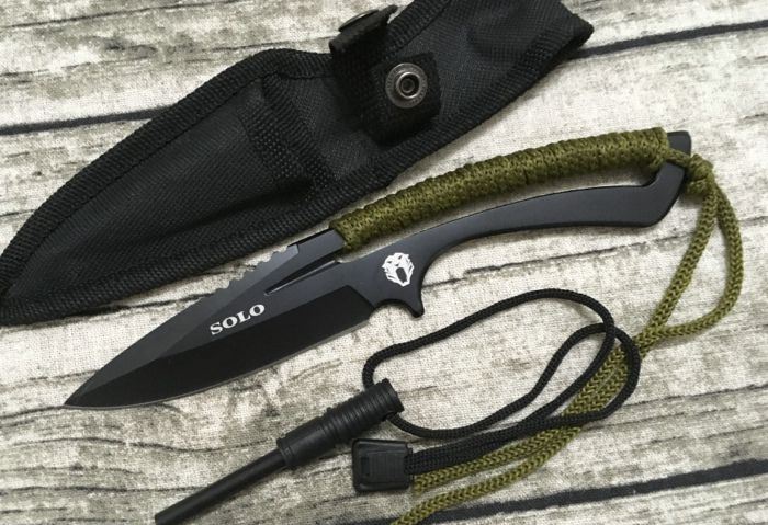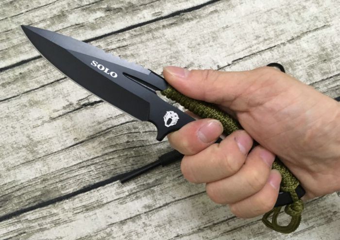 SOLO求生直刀(出品货) 全 长:20.5cm 刃 长:9.5cm 柄 长:11cm 刃 宽:3.5cm(最宽处) 刃 厚:3.5mm 刃 材:8CR13 硬 度:58HRC 表 面:发黑 重 量:150克 备 注:带打火石