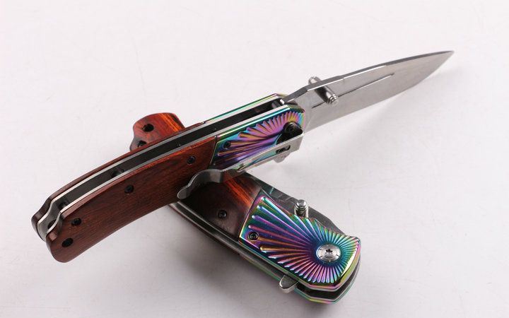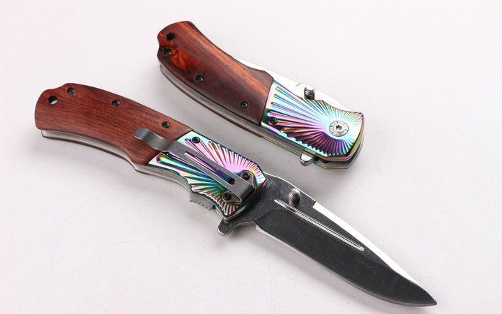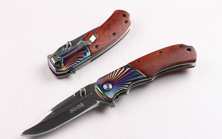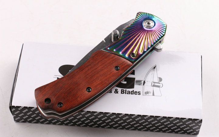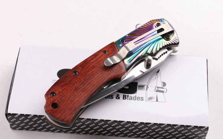 SOG索格DA82快开折刀 全 长:22.3cm 刃 长:9.8cm 柄 长:125cm 刃 宽:2.8cm 刃 厚:3.7mm 刃 材:5CR15 重 量:200g (含包装物) 硬 度:58HRC 表 面:彩钛钢头+石洗镜光 柄 材:全钢片+天然木片 锁 型:线锁 结 构:线锁结构 其 他:彩盒